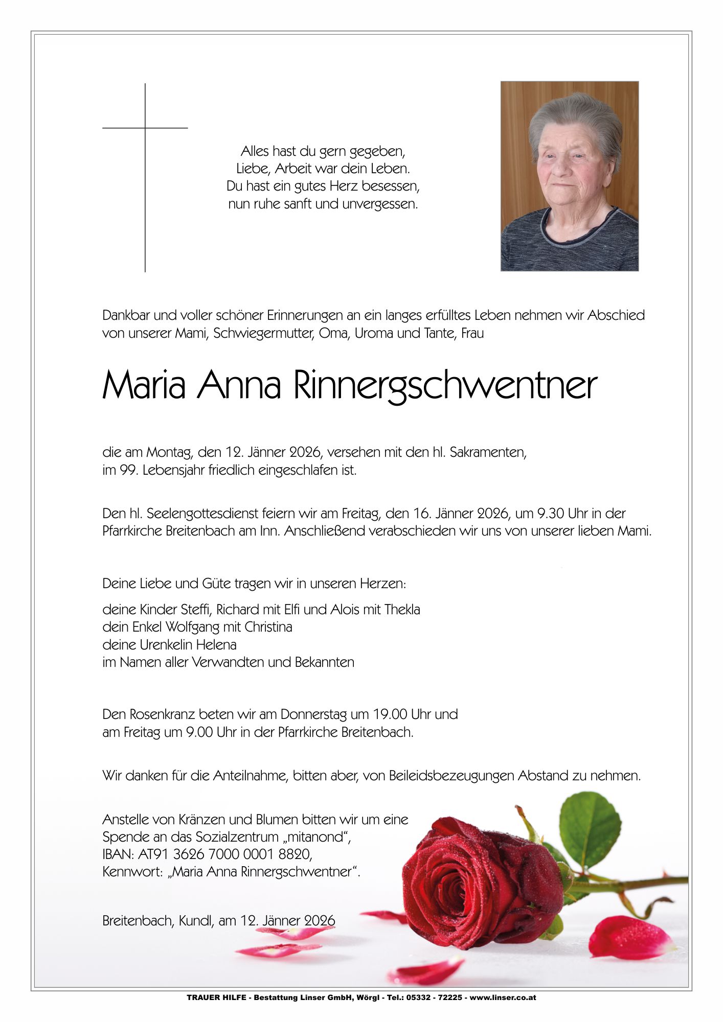 Bestattung wurde durchgeführt von: Walter Linser TrauerHilfe Bestattung Linser GmbH Wildschönauerstraße 41 6300 - Wörgl Tel.: 05332 72225 zum Bestatter