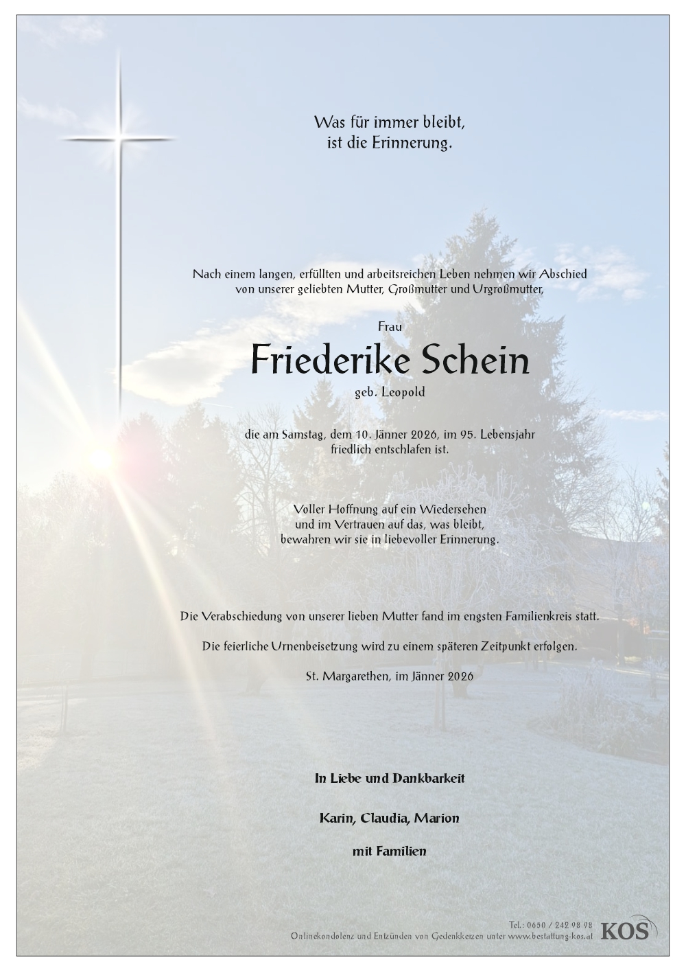 Friedhof Ortsfriedhof St. Margarethen/neu, † 10.01.2026 (94 Jahre)