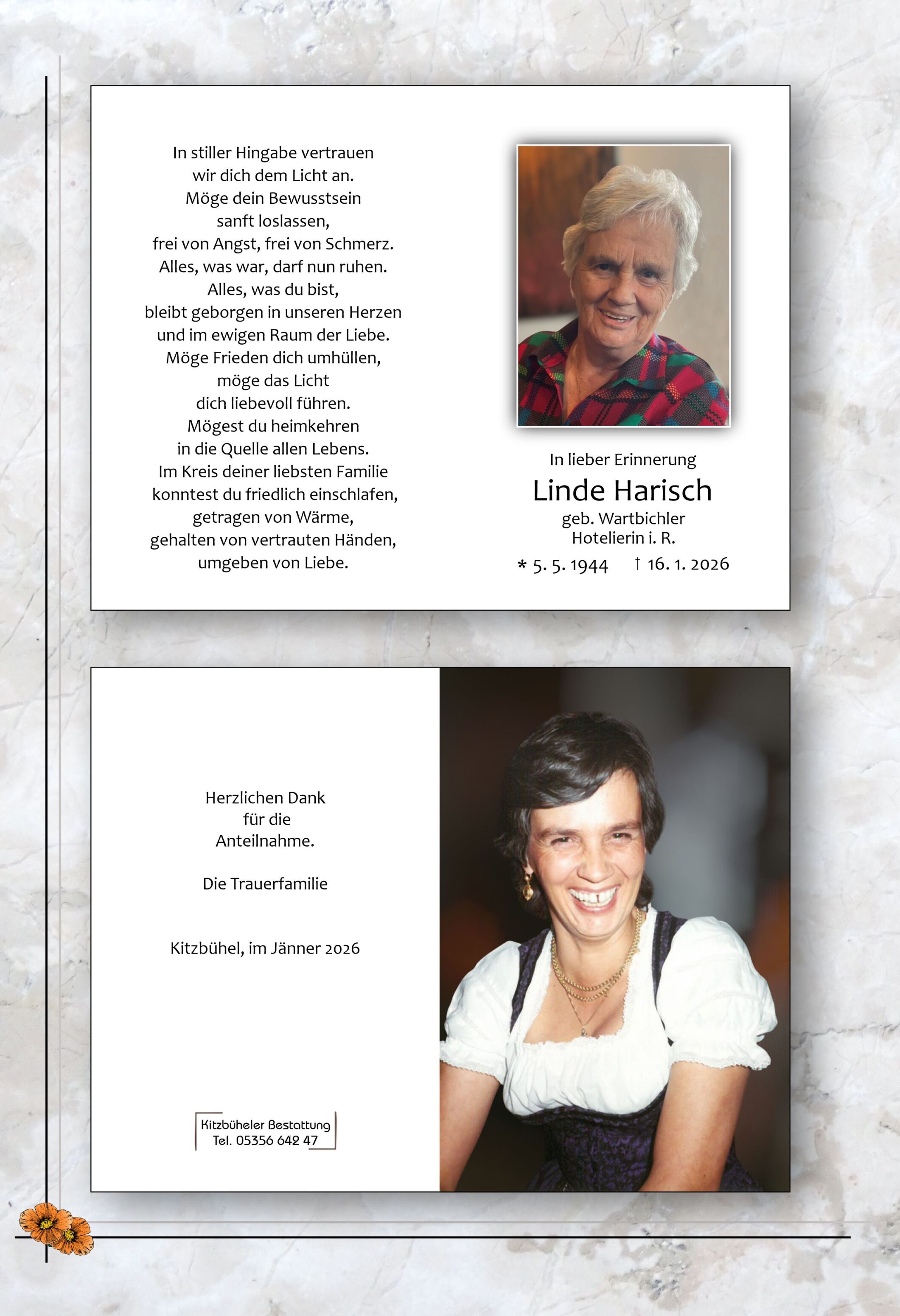 Seit ich eure sehr berührende Traueranzeige gelesen habe, sind ganz viele herzliche Erinnerungen an frühere Zeiten wieder lebendig. Linde - meine großzügige Firm-Godi und langjährige Freundin unserer Familie – habe ich schon als Kind sehr in mein Herz geschlossen. Im „Hinterstadl“ waren unsere Eltern ja quasi Nachbarn und wann immer Tante Linde, wie ich sie damals nannte, nur ein bisschen ihrer kostbaren Zeit zwischen der vielen Arbeit im Hotel, in der Küche aber auch in der Metzgerei, erübrigen konnte, kam sie gerne – meistens im weißen Schurz – auf einen kurzen Ratscher oder ein „Zigaretterl“ (von dem natürlich niemand wissen durfte) zu uns ins Kino-Haus.