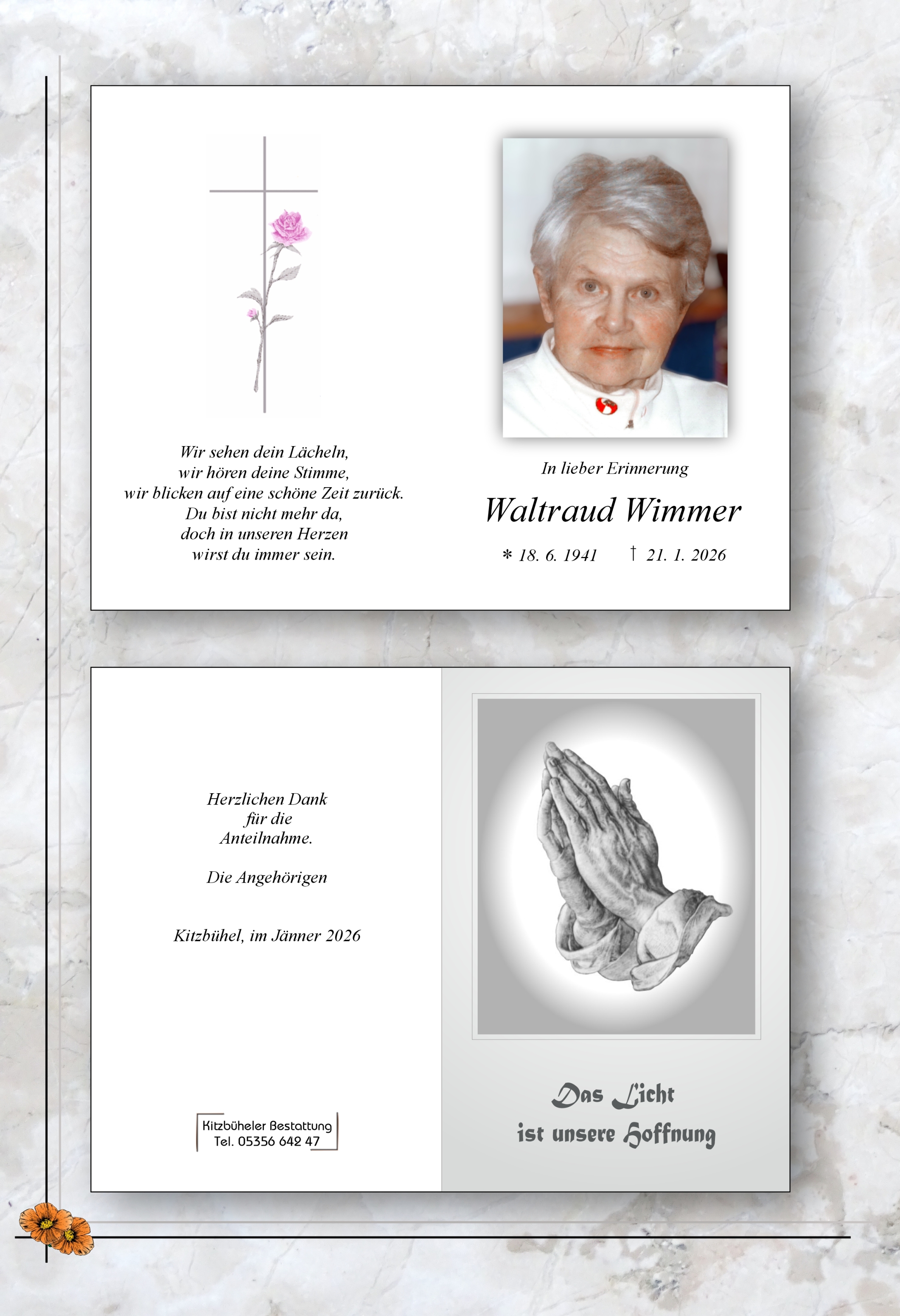 Bestattung wurde durchgeführt von: Kitzbüheler Bestattung Kitzbüheler Bestattung Kitzbüheler Bestattung WV GmbH Jochberger Straße 62 6370 - Kitzbühel Tel.: 05356 642 47 Tel.: 050 1717 180 zum Bestatter