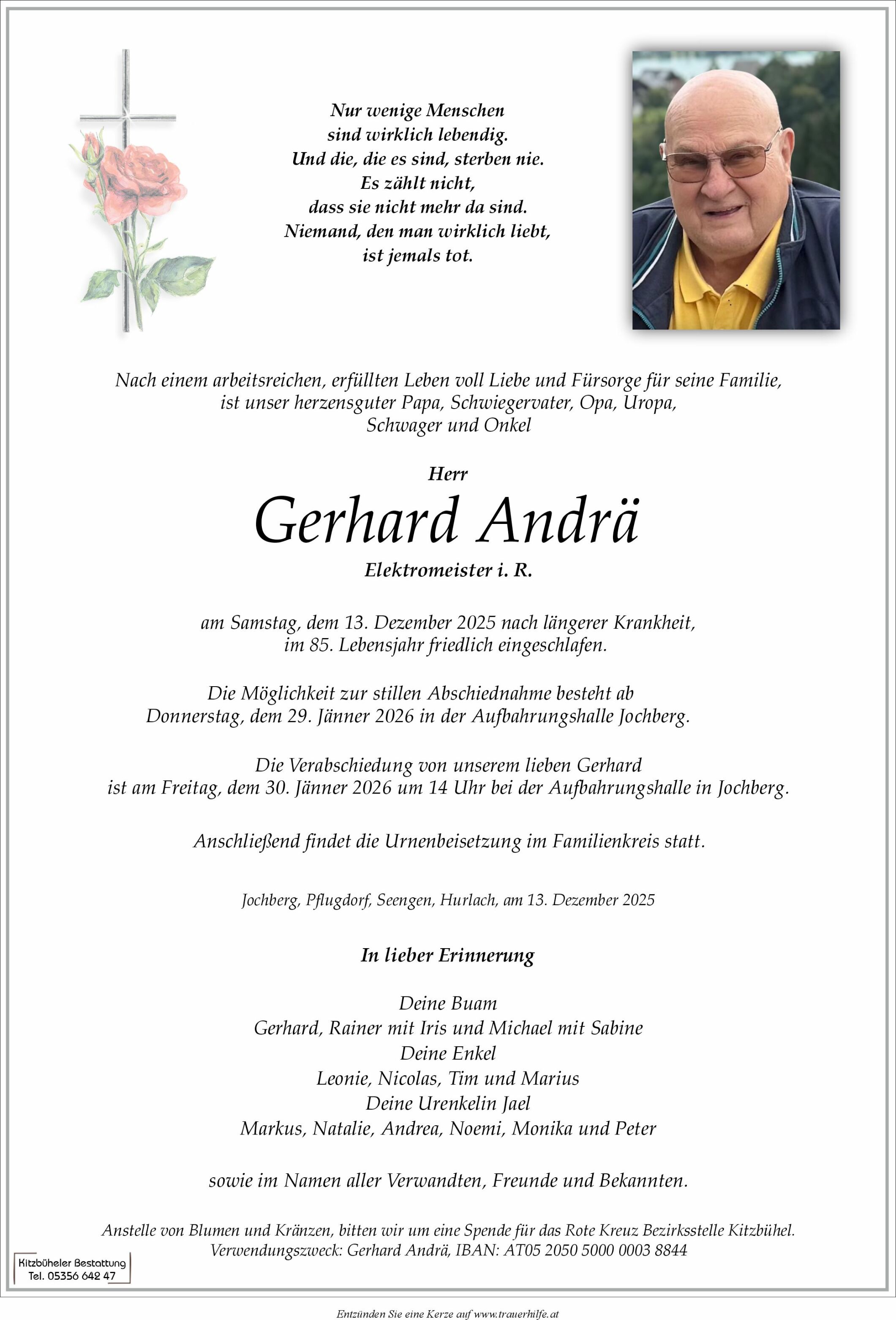 Bestattung wurde durchgeführt von: Kitzbüheler Bestattung Kitzbüheler Bestattung Kitzbüheler Bestattung WV GmbH Jochberger Straße 62 6370 - Kitzbühel Tel.: 05356 642 47 Tel.: 050 1717 180 zum Bestatter