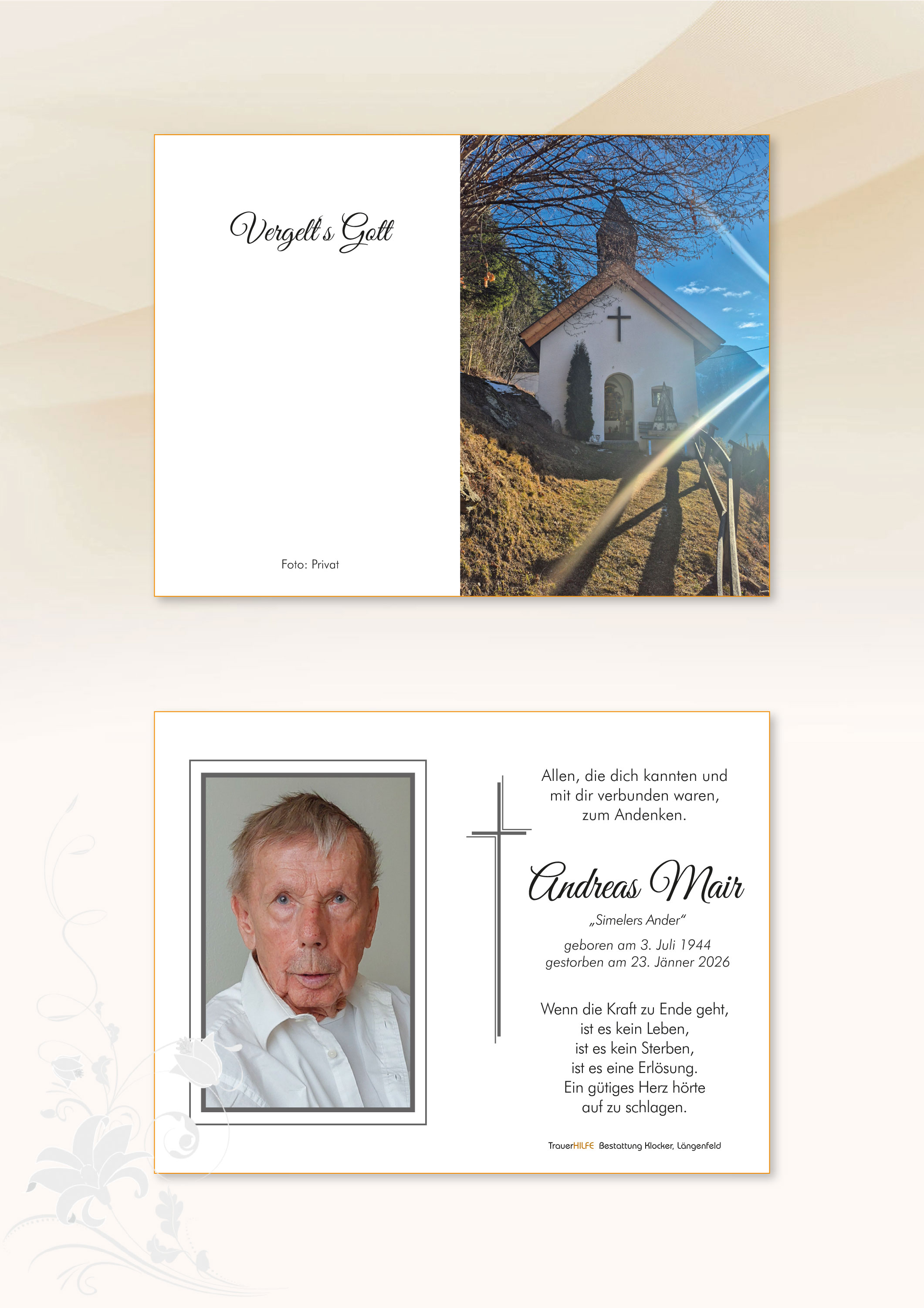 Bestattung wurde durchgeführt von: Daniel Klocker Bestattung Klocker GmbH Oberlängenfeld 41 6444 - Längenfeld Tel.: 05253 5561 zum Bestatter