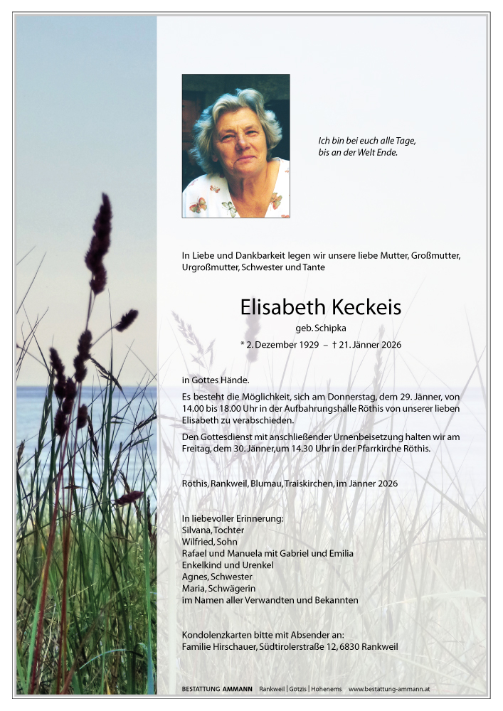 Bestattung wurde durchgeführt von: Bestattung Ammann Rankweil Ammann Bestattung GmbH Rankweil Splügenweg 1 6830 - Rankweil Tel.: 05522 42104 zum Bestatter