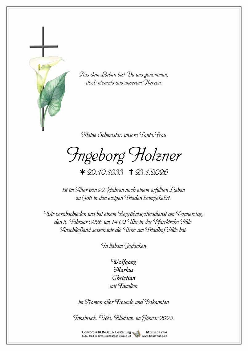 Bestattung wurde durchgeführt von: Mag. Martin Müller Concordia Bestattung 6020 - Innsbruck Reichenauer Str. 95 6060 - Hall i. T. Salzburger Str. 33 Tel.: 0512 34 34 33 Tel.: 05223 57 2 54 zum Bestatter