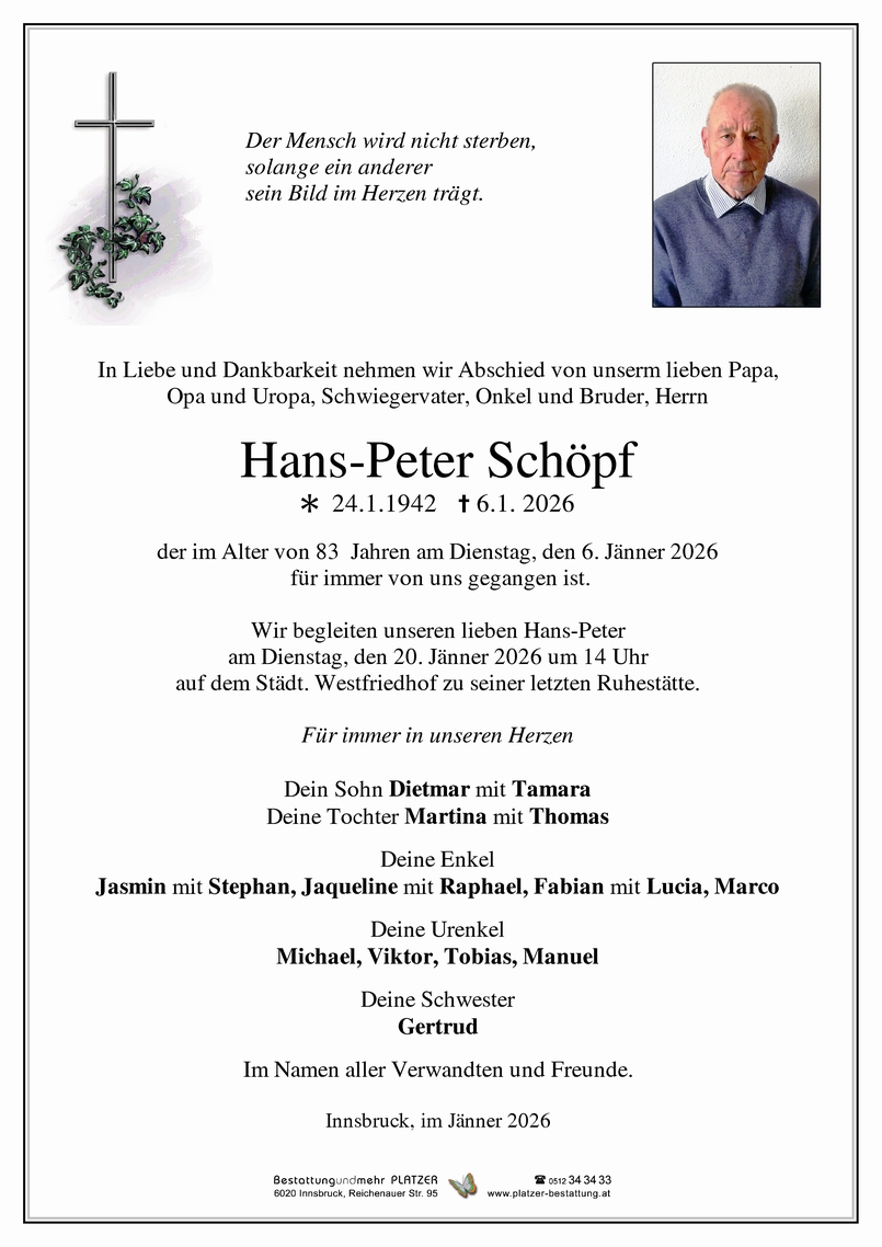 Bestattung wurde durchgeführt von: Mag. Martin Müller Concordia Bestattung 6020 - Innsbruck Reichenauer Str. 95 6060 - Hall i. T. Salzburger Str. 33 Tel.: 0512 34 34 33 Tel.: 05223 57 2 54 zum Bestatter