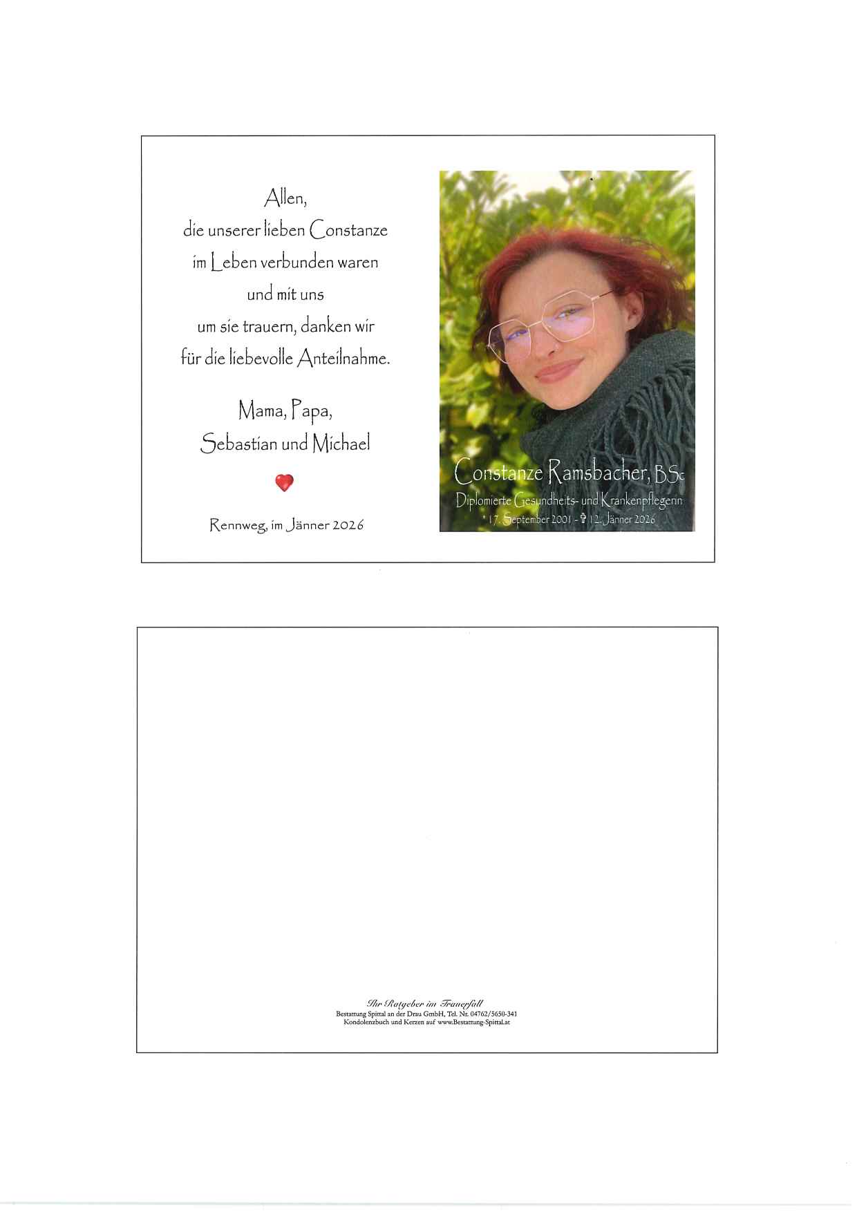 Bestattung wurde durchgeführt von: Gerald Baumgartner/Franz Kramaritsch/Sylvia Wippl Gerald Baumgartner/Franz Kramaritsch/Sylvia Wippl Städtische Bestattungsanstalt Spittal an der Drau Edlinger Straße 55 9800 - Spittal an der Drau Tel.: 04762 5650341 zum Bestatter