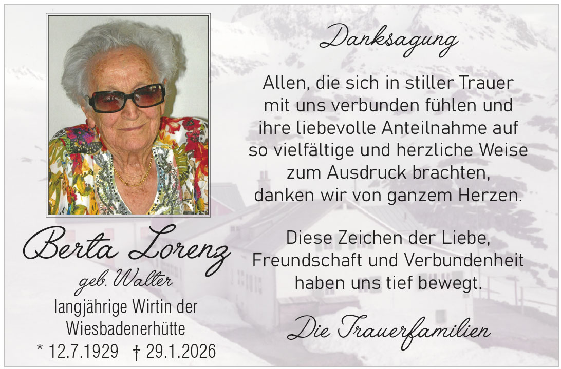 Jetzt kannst du wieder deinen liebsten Menschen begegnen, deinem Papa Emil. Nicht zu vergessen deine Mama Aloisia, Schwestern Frieda & Maria, deinem Halbbruder Johann Ulrich, deinem Edmund und allen anderen vorausgegangen Seelen. Dir Walter wünsche ich viel Kraft zum Verlust deiner Berta. Möge sie in Frieden ruhen.30.01.2026 21:53 - Patrick Narr, See