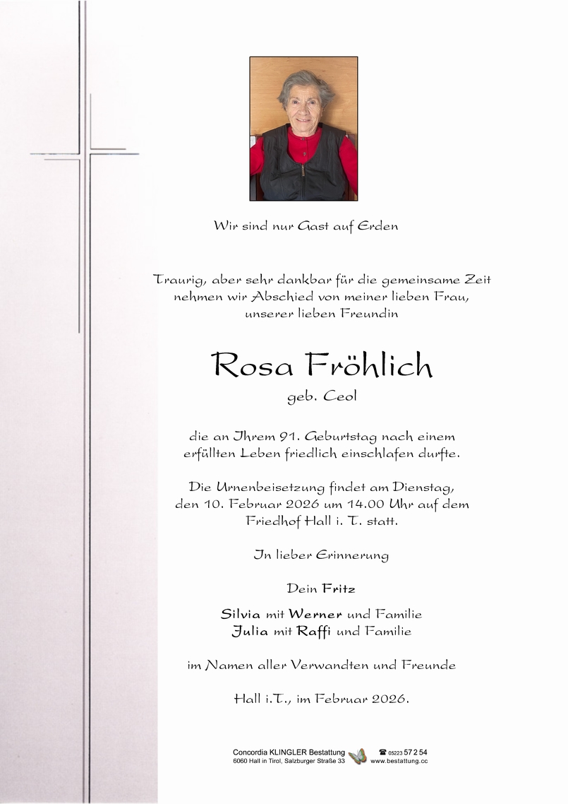 Bestattung wurde durchgeführt von: Mag. Martin Müller Concordia Bestattung 6020 - Innsbruck Reichenauer Str. 95 6060 - Hall i. T. Salzburger Str. 33 Tel.: 0512 34 34 33 Tel.: 05223 57 2 54 zum Bestatter