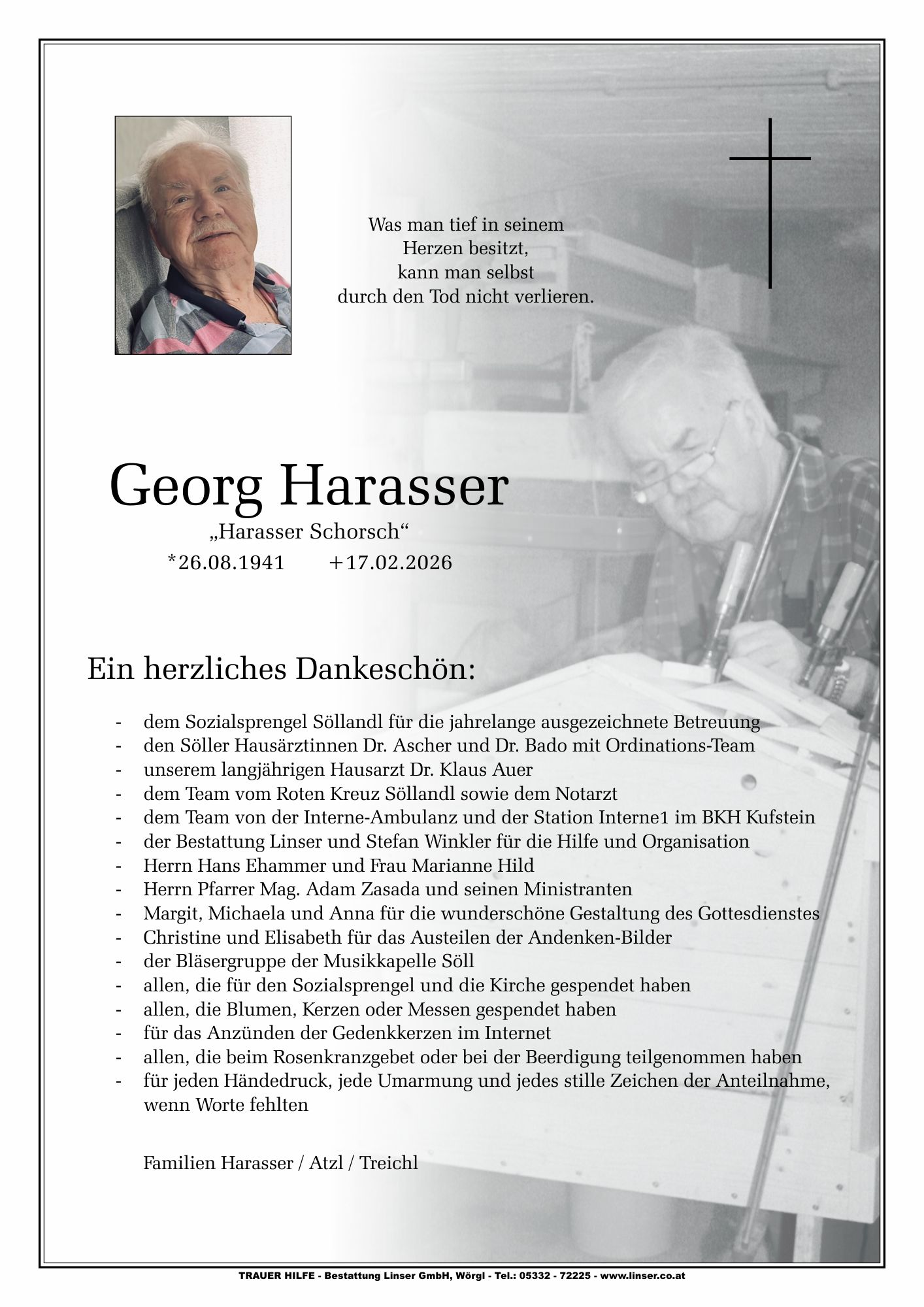 Bestattung wurde durchgeführt von: Walter Linser TrauerHilfe Bestattung Linser GmbH Wildschönauerstraße 41 6300 - Wörgl Tel.: 05332 72225 zum Bestatter