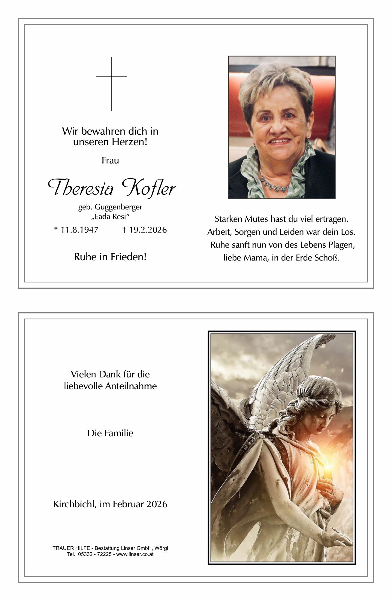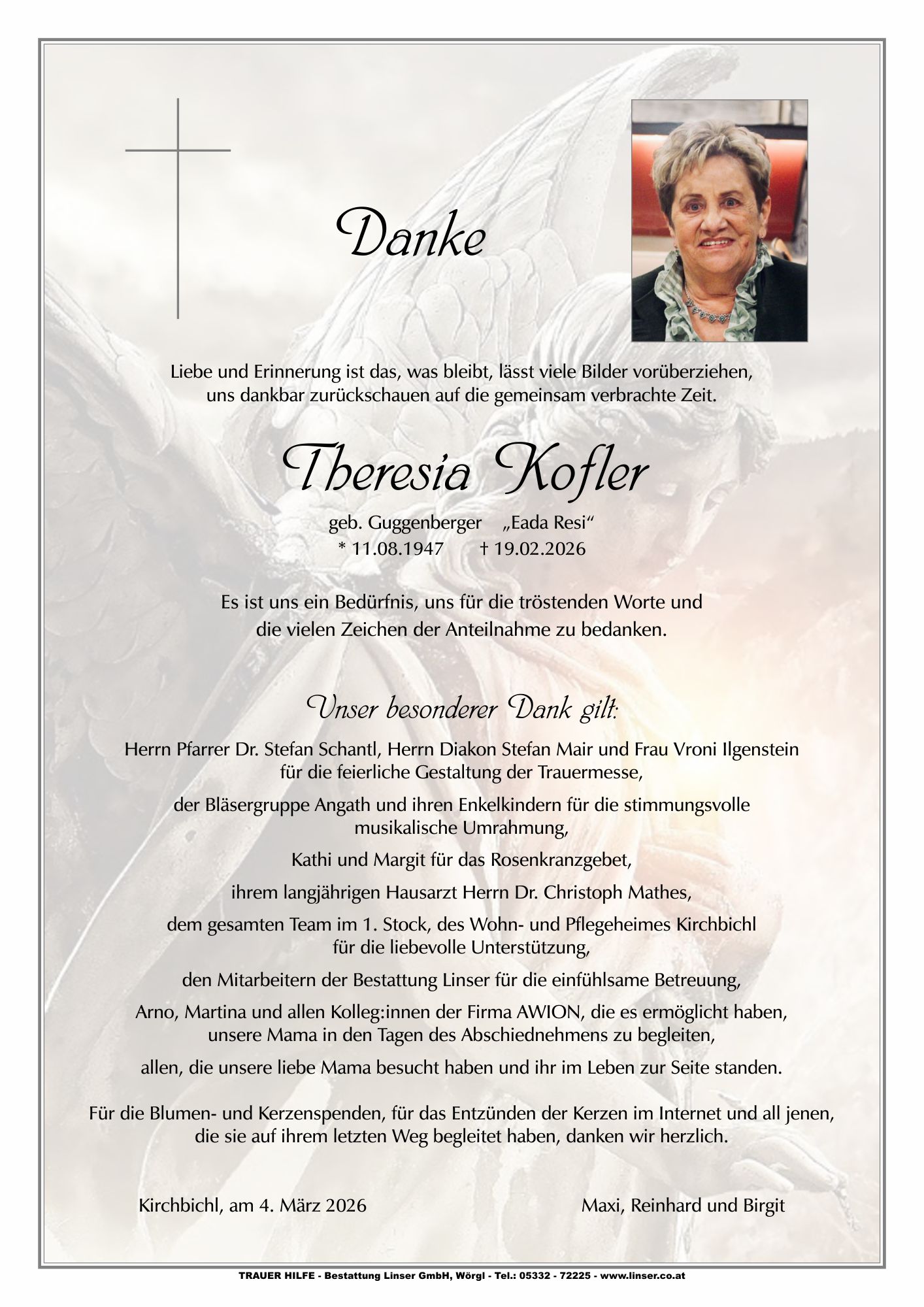 Bestattung wurde durchgeführt von: Walter Linser TrauerHilfe Bestattung Linser GmbH Wildschönauerstraße 41 6300 - Wörgl Tel.: 05332 72225 zum Bestatter