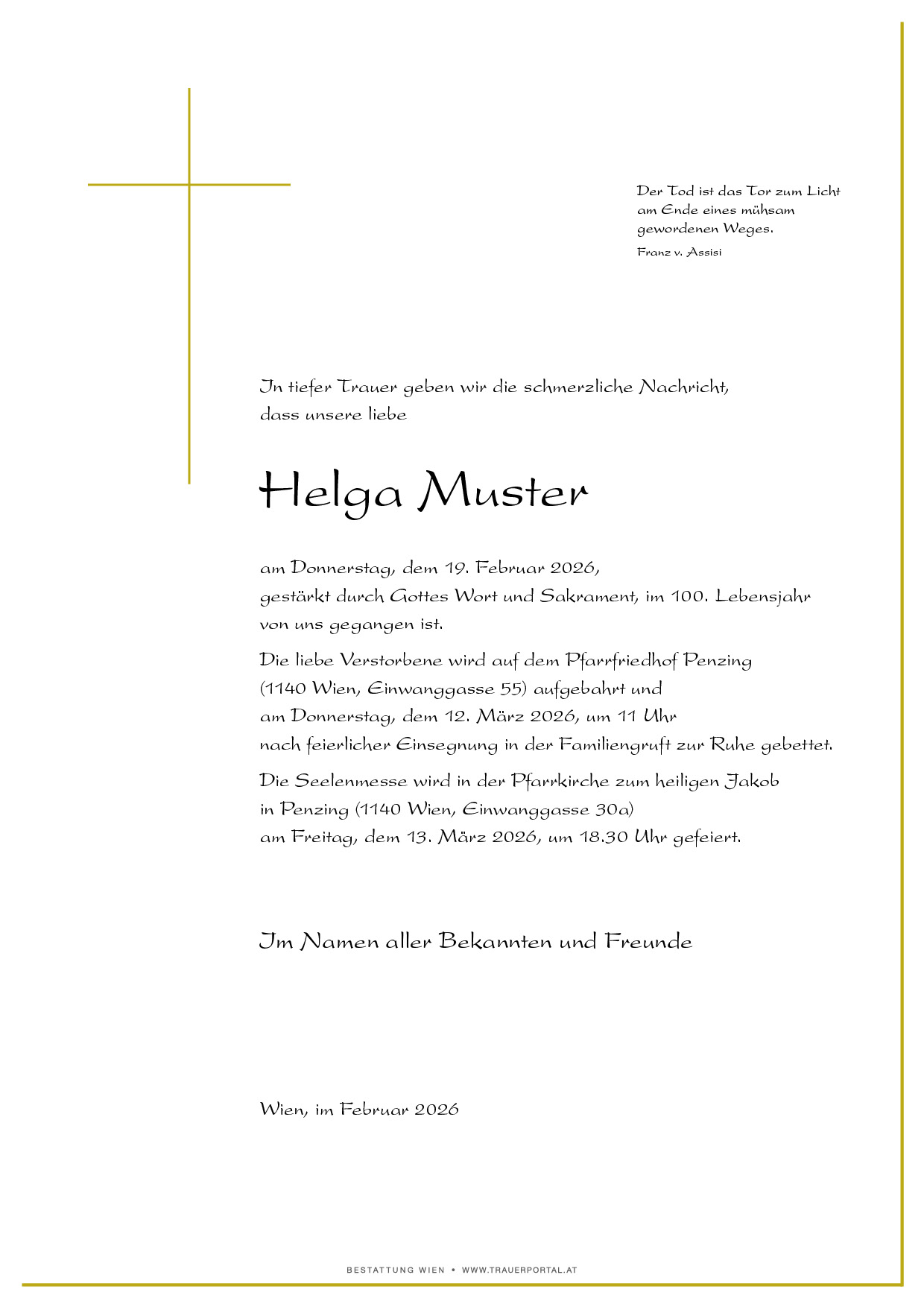 Bestattung wurde durchgeführt von: Bestattung Wien Bestattung Wien GmbH Simmeringer Hauptstraße 339 1110 - Wien (Simmering) Tel.: 01 501950 zum Bestatter