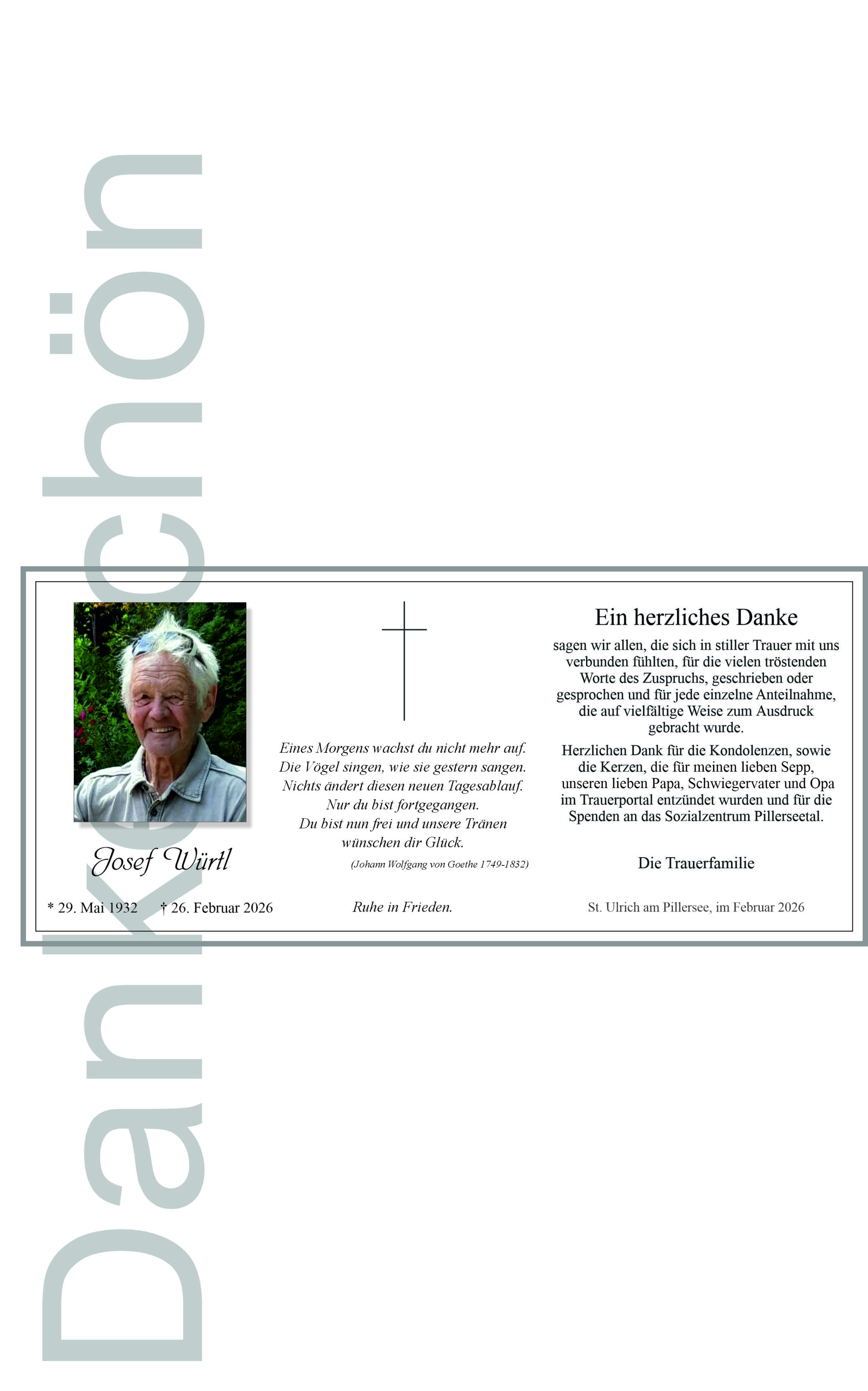 Danke nomoi für Alles, dafür dass Du mit damals 82 Jahren noch bei mir am Neubau auf dem Dachstuhl gestanden bist und geholfen hast, dass ich einmal ein Dach über dem Kopf habe und die Holzterrasse wird mich immer an Dich erinnern. Die oft aufgeregten Gespräche wenn wir uns über den Weg gelaufen sind, werden mir fehlen. Du wirst fehlen. Mach's guad und grüß mir Mama und Papa.