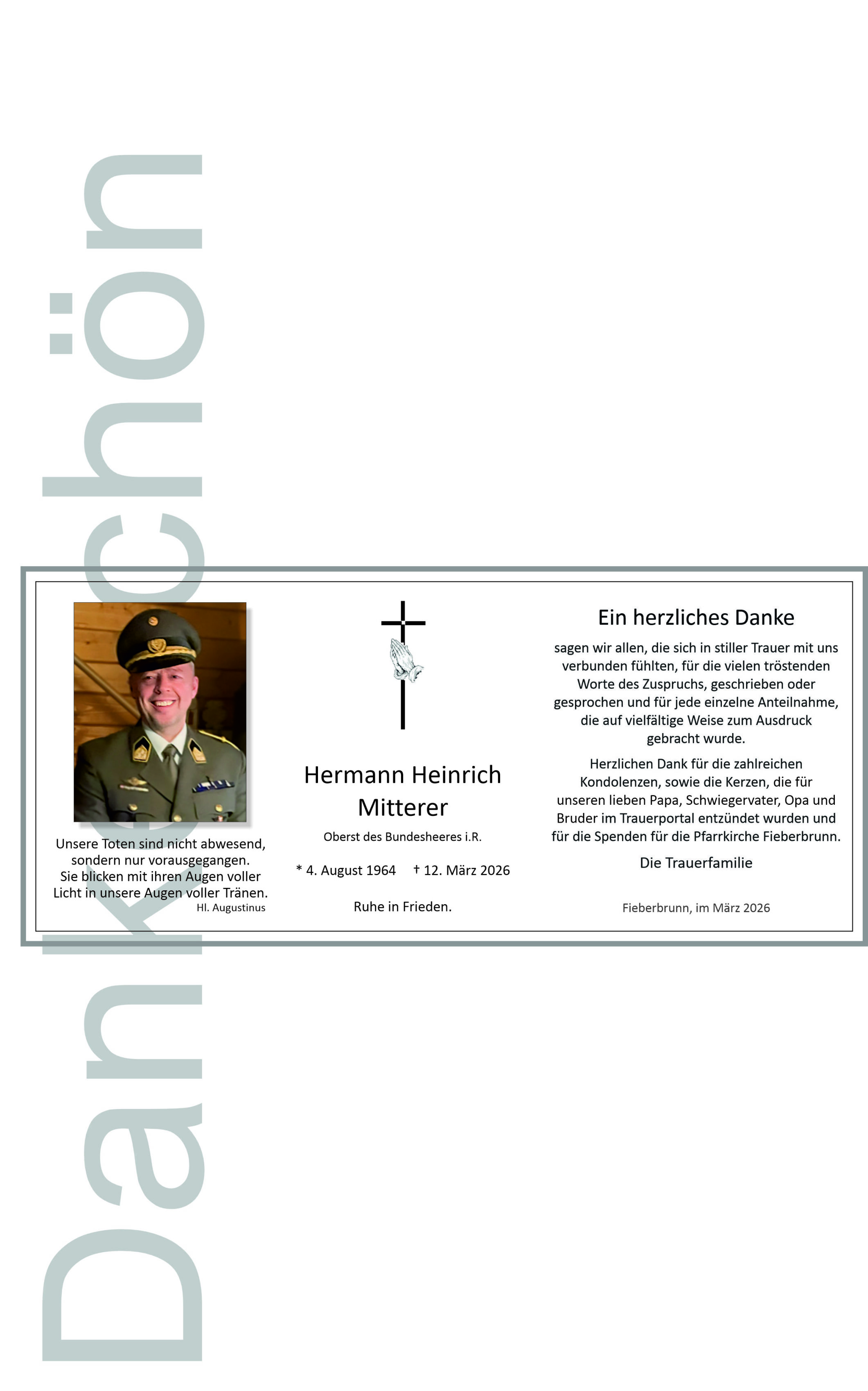 Von Herzen mein aufrichtigstes Mitgefühl. Ich bin in Gedanken bei Hermann sowie bei euch und bete aus der Ferne für und mit euch. Mögen euch Gebete und die Gemeinschaft durch diese anspruchsvolle Zeit tragen. Hermann ist präsent im Gebet und in wundervollen Erinnerungen aus Kindheitstagen als feiner Nachbar, geschickt im Handwerk, mit gutem Schmäh auf den Lippen, feschem Hut auf dem Kopf und Haltung! Bestürzt über die Nachricht sende ich euch Trost und bin in Gedanken bei euch.