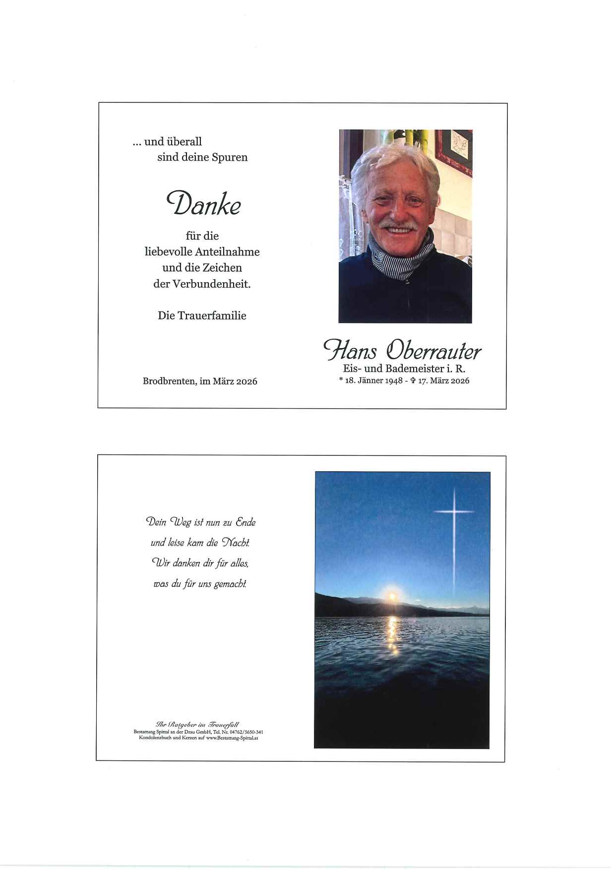 Bestattung wurde durchgeführt von: Gerald Baumgartner/Franz Kramaritsch/Sylvia Wippl Gerald Baumgartner/Franz Kramaritsch/Sylvia Wippl Städtische Bestattungsanstalt Spittal an der Drau Edlinger Straße 55 9800 - Spittal an der Drau Tel.: 04762 5650341 zum Bestatter