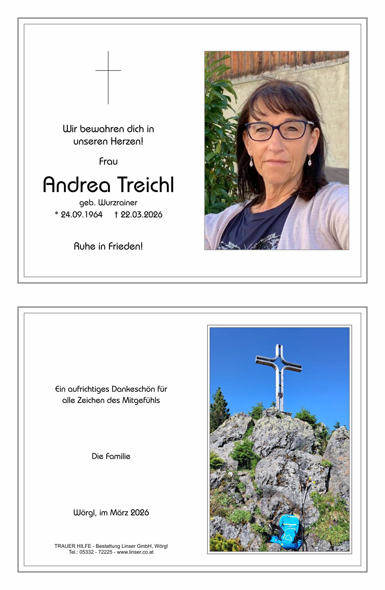 Liebe Andrea , Mia Achte hom a so scheane,lustige Zeit verbracht Dia tollen Ausflüge mitn Bus nach Ungarn und vieles mehr. Dann hot sie die Krankheit eingeschlichen zeascht bei HP U Markus. Nit long her hot ins dann Regina verlassen und jetzt Du, So Stark und immer mit Zuversicht viel Kraft hast du die letzte Zeit mit deinen Lieben verbracht,Das Leben ist für alle eine Pusteblume wenn die Zeit gekommen ist, muss jeder alleine Fliegen,Griass ins alle Lieben da oben, Auf ein Wiedersehen Herta und Hanspeter mit Familie 🌹🌹🕯️🕯️