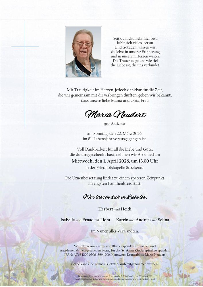 Bestattung wurde durchgeführt von: Frittum Maria Anna TrauerHilfe Bestattung Frittum Bahnstrasse 255 2041 - Wullersdorf Tel.: 050 1717-600 zum Bestatter