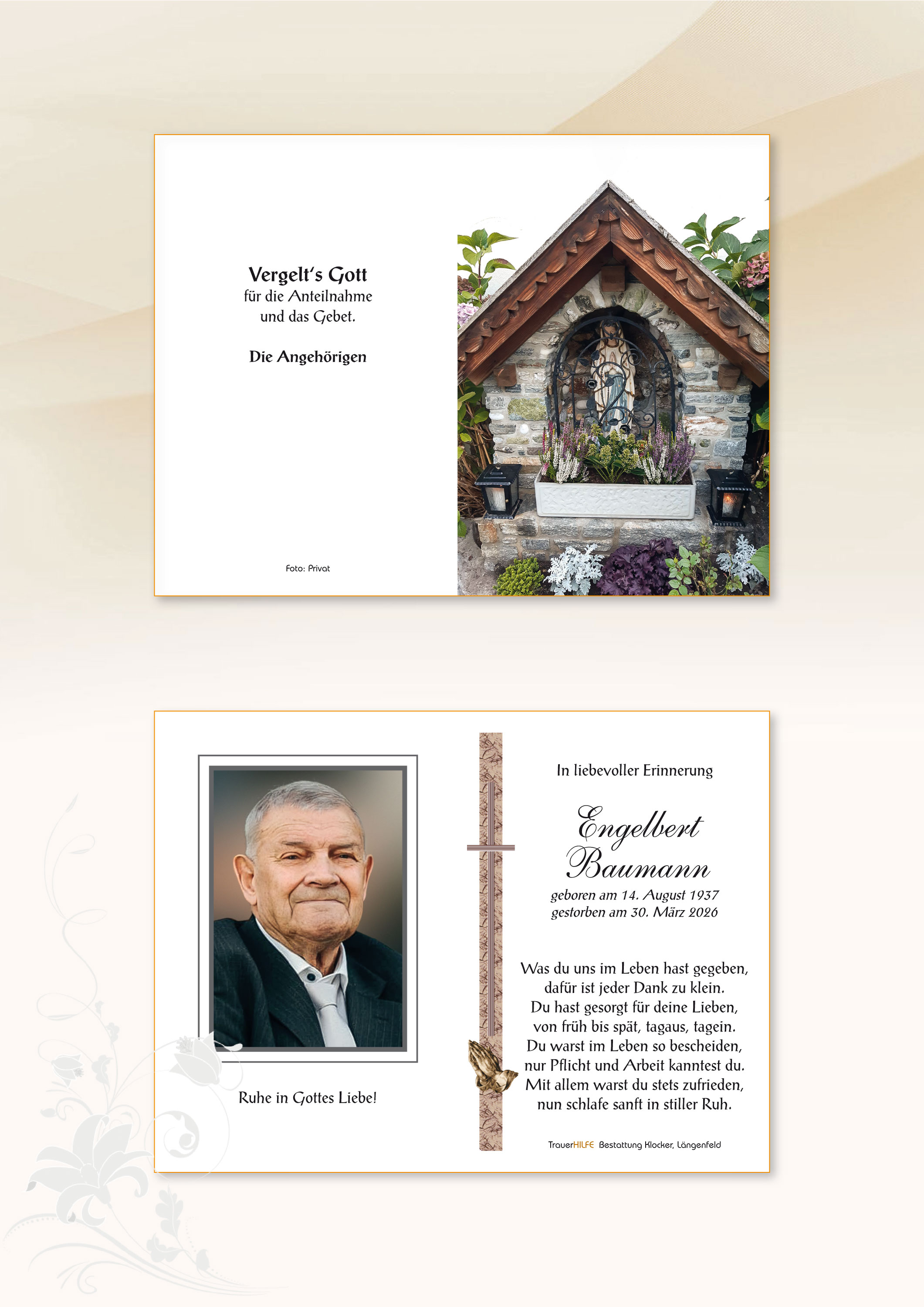 Bestattung wurde durchgeführt von: Daniel Klocker Bestattung Klocker GmbH Oberlängenfeld 41 6444 - Längenfeld Tel.: 05253 5561 zum Bestatter