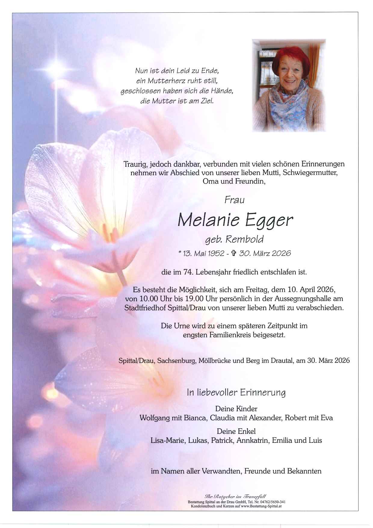 Bestattung wurde durchgeführt von: Gerald Baumgartner/Franz Kramaritsch/Sylvia Wippl Gerald Baumgartner/Franz Kramaritsch/Sylvia Wippl Städtische Bestattungsanstalt Spittal an der Drau Edlinger Straße 55 9800 - Spittal an der Drau Tel.: 04762 5650341 zum Bestatter