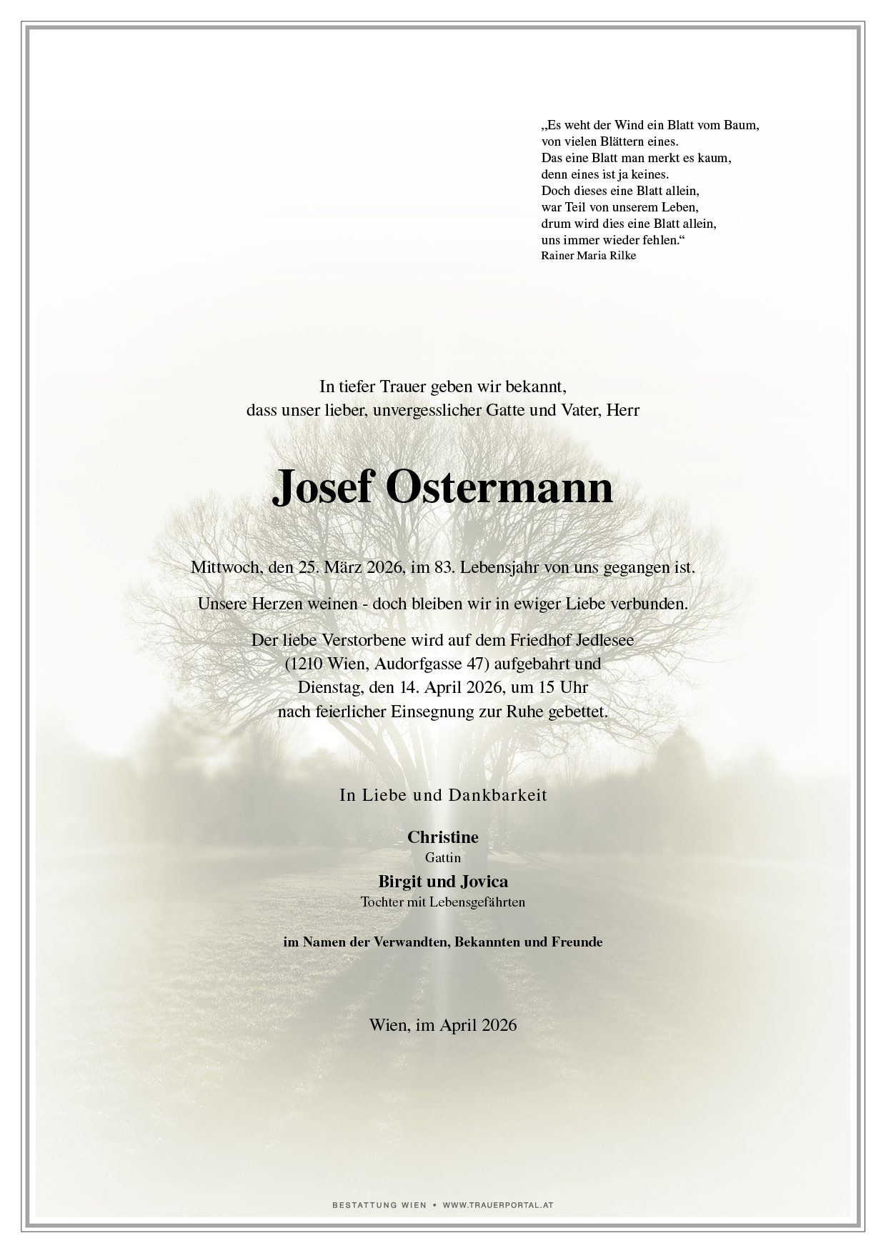 Bestattung wurde durchgeführt von: Bestattung Wien Bestattung Wien GmbH Simmeringer Hauptstraße 339 1110 - Wien (Simmering) Tel.: 01 501950 zum Bestatter