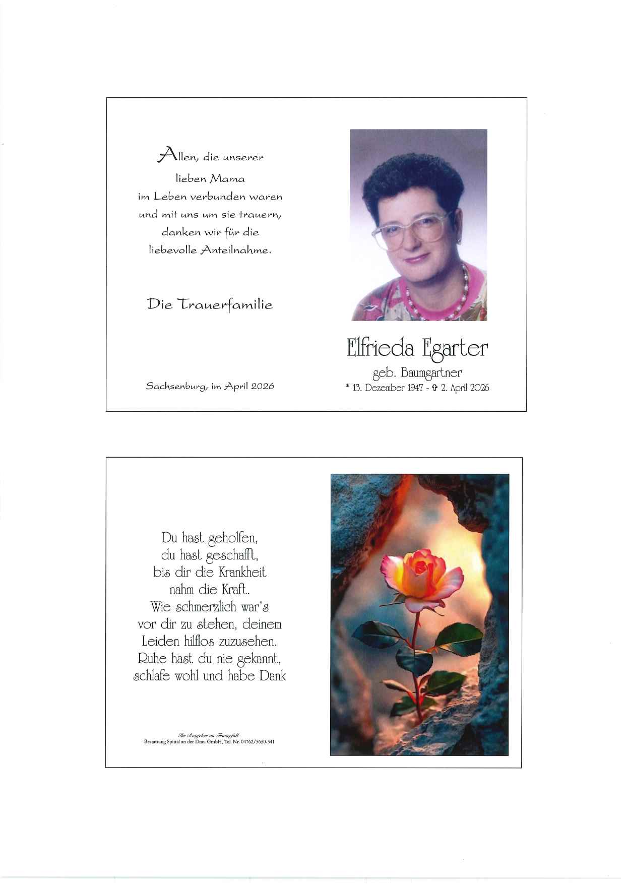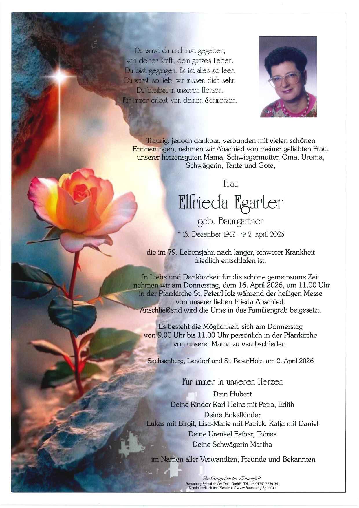 Bestattung wurde durchgeführt von: Gerald Baumgartner/Franz Kramaritsch/Sylvia Wippl Gerald Baumgartner/Franz Kramaritsch/Sylvia Wippl Städtische Bestattungsanstalt Spittal an der Drau Edlinger Straße 55 9800 - Spittal an der Drau Tel.: 04762 5650341 zum Bestatter