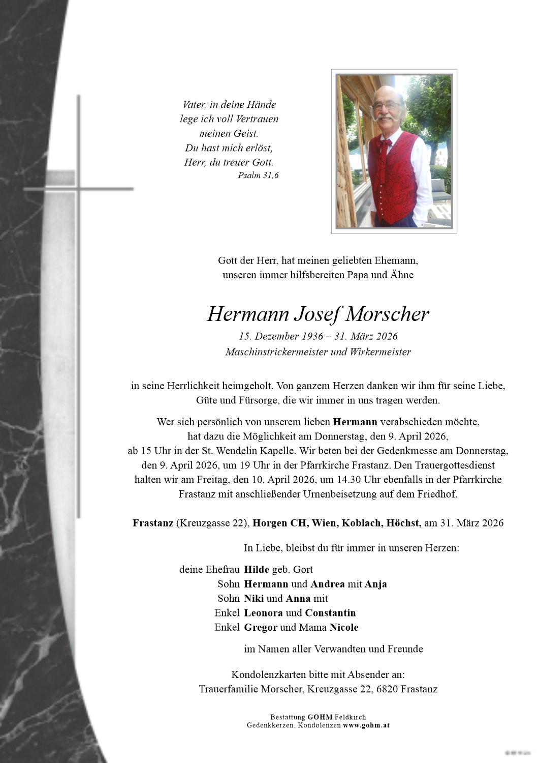 Bestattung wurde durchgeführt von: Martin Gohm Martin Gohm Bestattung Gohm Schregenbergstraße 5 6800 - Feldkirch Tel.: 05522 76071 zum Bestatter