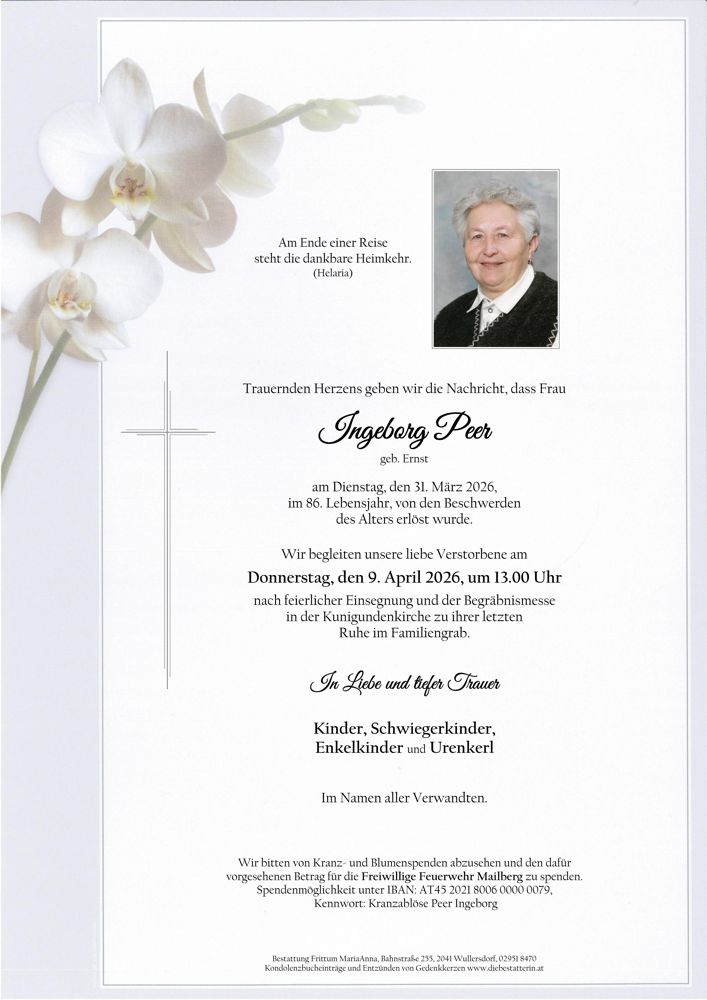 Bestattung wurde durchgeführt von: Frittum Maria Anna TrauerHilfe Bestattung Frittum Bahnstrasse 255 2041 - Wullersdorf Tel.: 050 1717-600 zum Bestatter