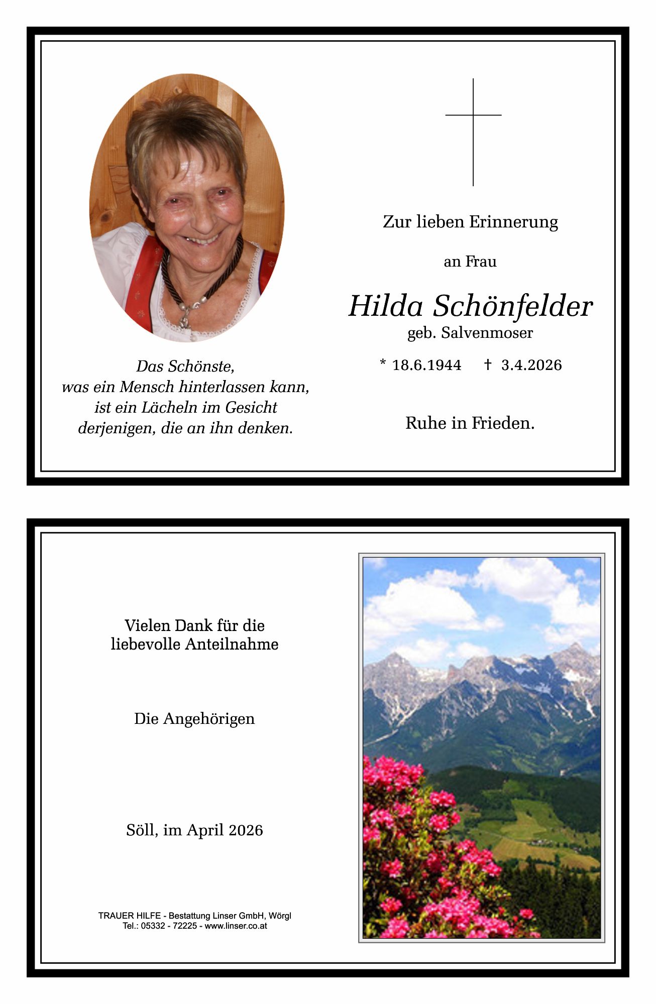 Bestattung wurde durchgeführt von: Walter Linser TrauerHilfe Bestattung Linser GmbH Wildschönauerstraße 41 6300 - Wörgl Tel.: 05332 72225 zum Bestatter