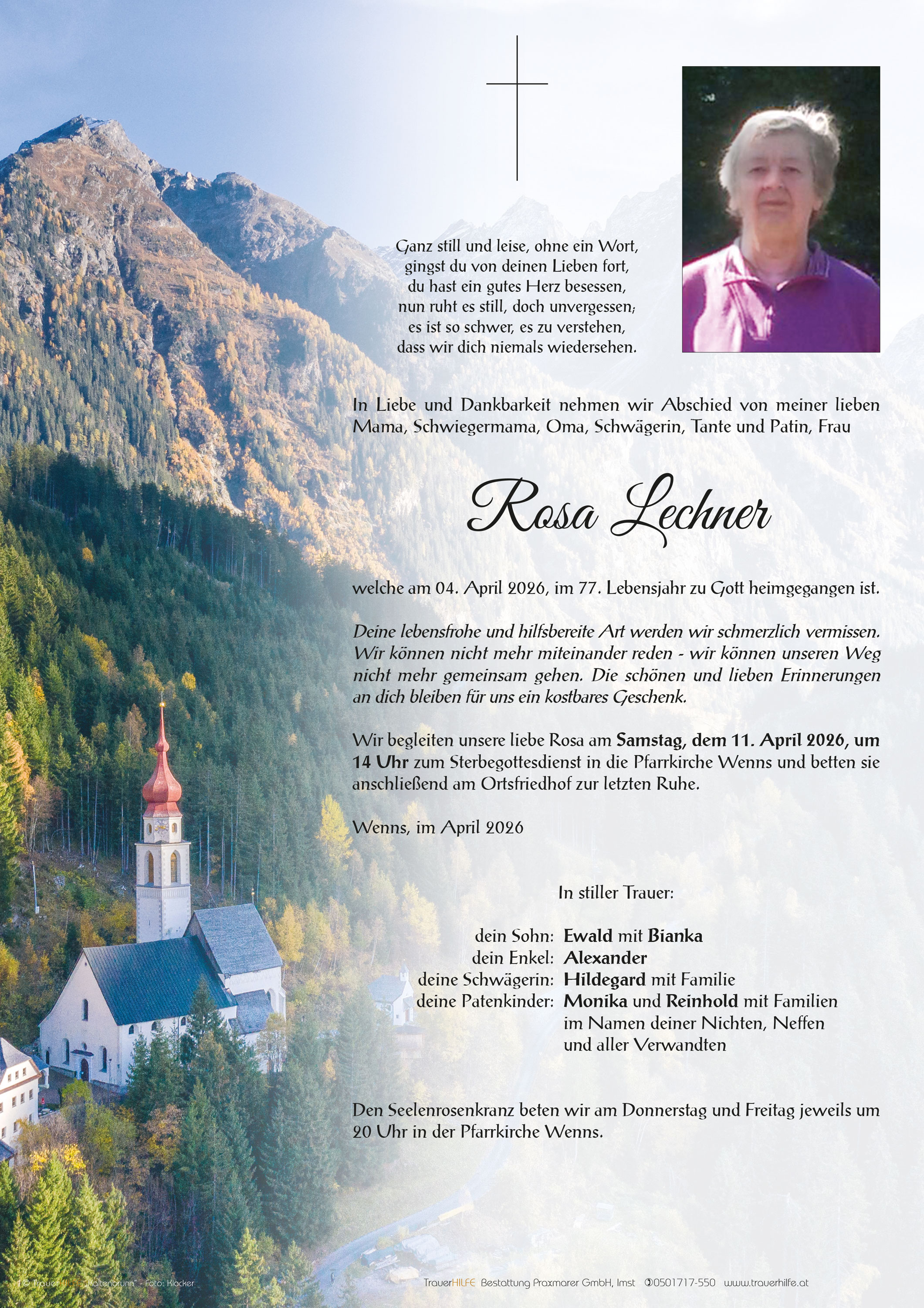 Rosa war meine Schulkollegin und Nachbarin! Ich denke gerne an unsere gemeinsamen Kinderjahre in Wenns zurück! Ich werde ihr ein ehrendes Andenken bewahren! Möge sie in Frieden ruhen