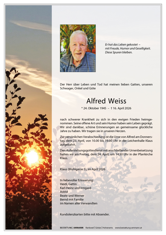 Friedhof Klaus, Friedhof, † 16.04.2026 (80 Jahre)