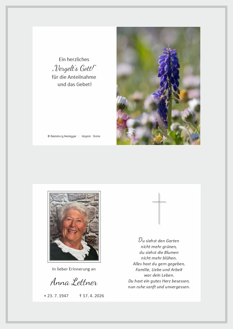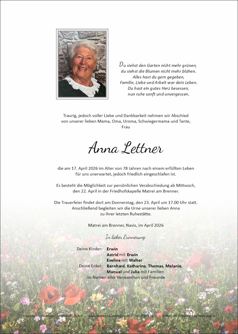 Bestattung wurde durchgeführt von: Karl Neurauter Karl Neurauter Bestattung Heidegger Brennerstraße 69 6150 - Steinach am Brenner Tel.: 05275 5211 zum Bestatter