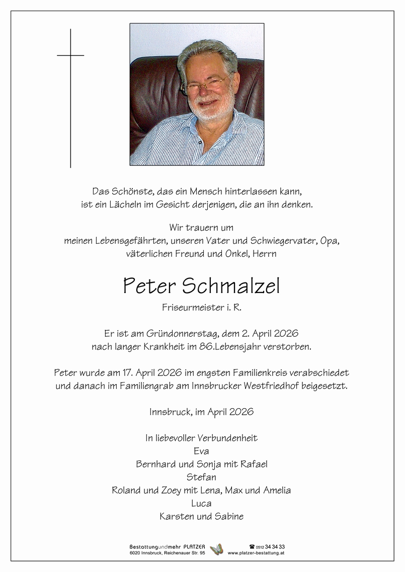 Bestattung wurde durchgeführt von: Mag. Martin Müller Concordia Bestattung 6020 - Innsbruck Reichenauer Str. 95 6060 - Hall i. T. Salzburger Str. 33 Tel.: 0512 34 34 33 Tel.: 05223 57 2 54 zum Bestatter