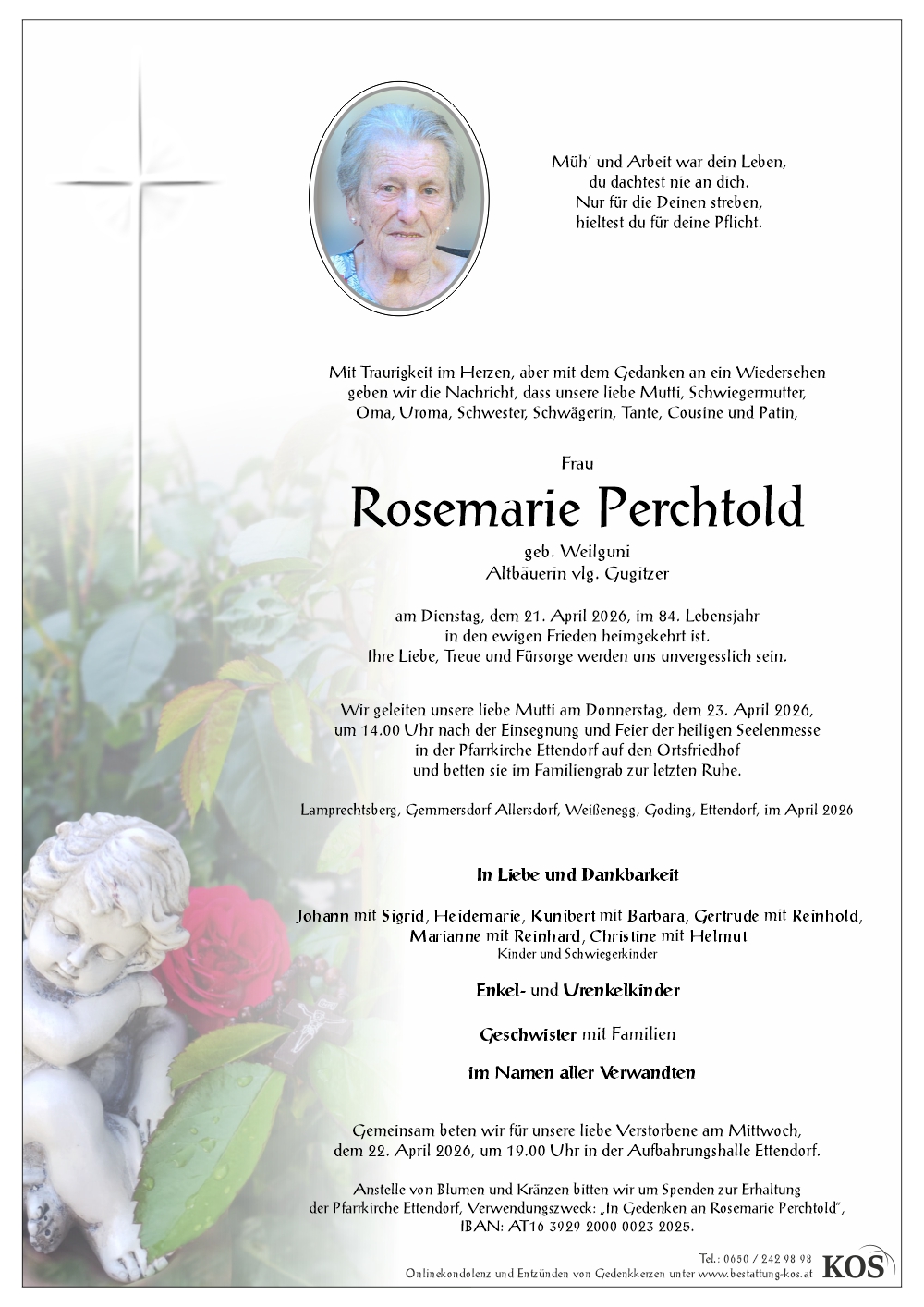 Bestattung wurde durchgeführt von: Familienbetrieb Bestattung Kos Bestattung A. & J. Kos GmbH Krankenhausstraße 2A 9400 - Wolfsberg Tel.: 0650 242 98 98 zum Bestatter