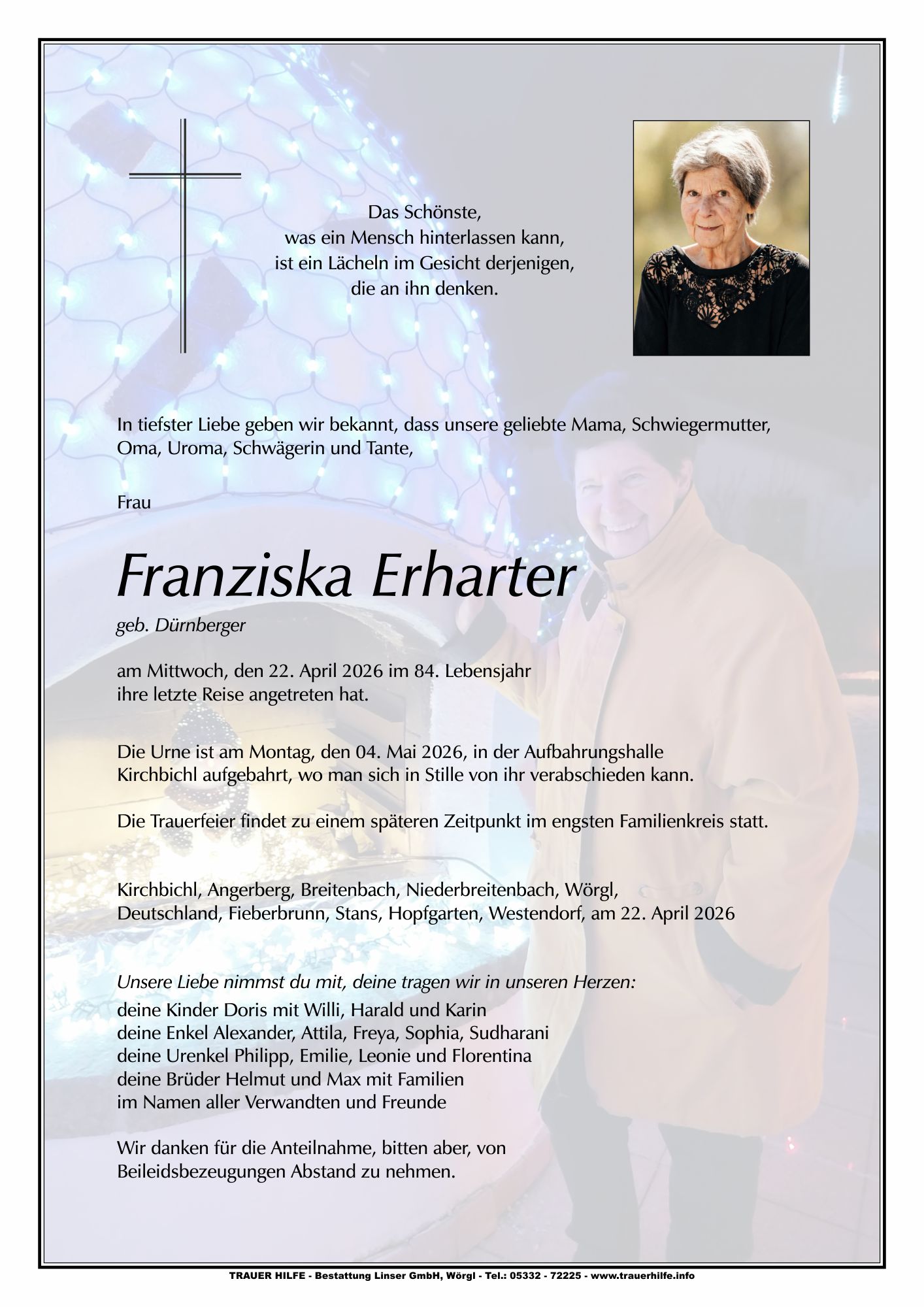 Bestattung wurde durchgeführt von: Walter Linser TrauerHilfe Bestattung Linser GmbH Wildschönauerstraße 41 6300 - Wörgl Tel.: 05332 72225 zum Bestatter
