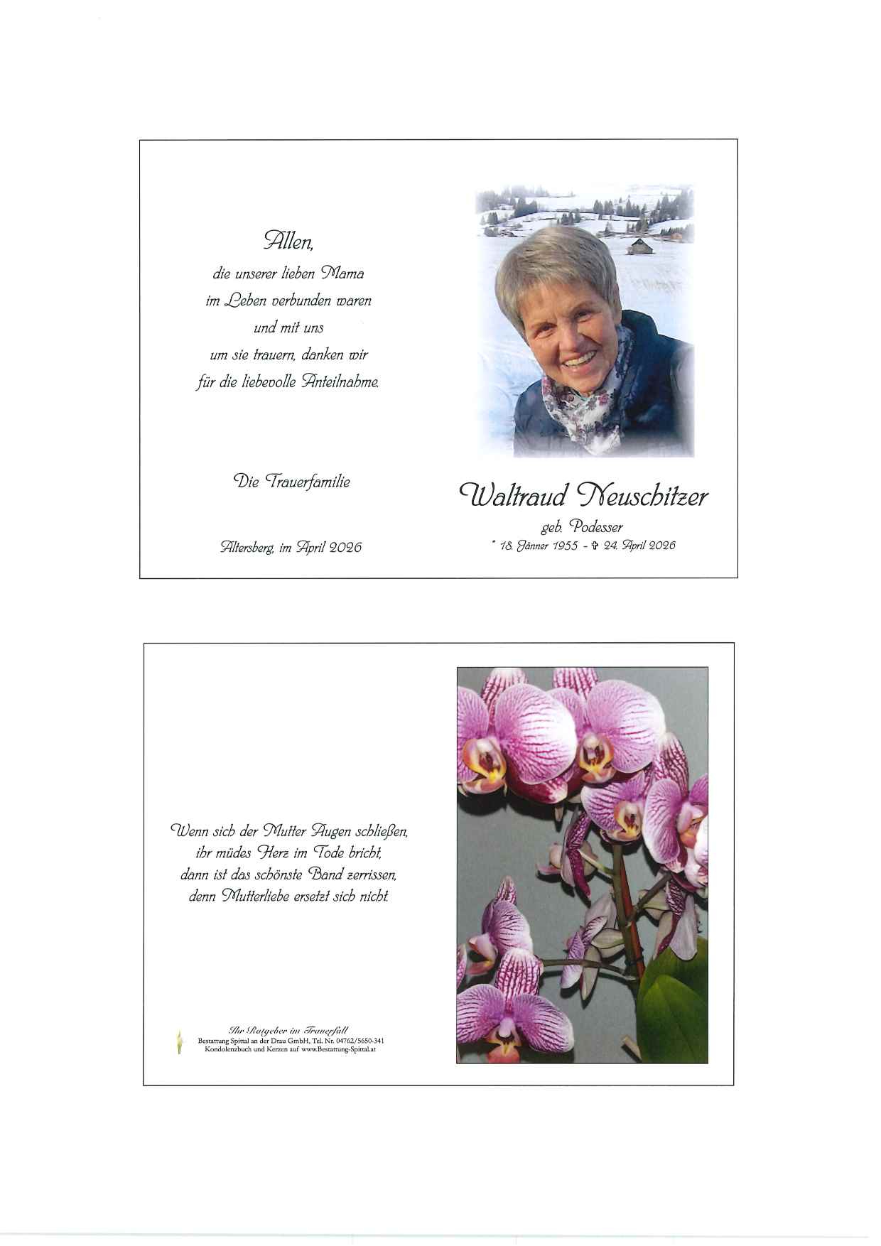 Bestattung wurde durchgeführt von: Gerald Baumgartner/Franz Kramaritsch/Sylvia Wippl Gerald Baumgartner/Franz Kramaritsch/Sylvia Wippl Städtische Bestattungsanstalt Spittal an der Drau Edlinger Straße 55 9800 - Spittal an der Drau Tel.: 04762 5650341 zum Bestatter