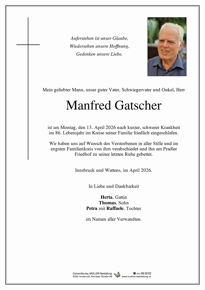 Bestattung wurde durchgeführt von: Mag. Martin Müller Concordia Bestattung 6020 - Innsbruck Reichenauer Str. 95 6060 - Hall i. T. Salzburger Str. 33 Tel.: 0512 34 34 33 Tel.: 05223 57 2 54 zum Bestatter