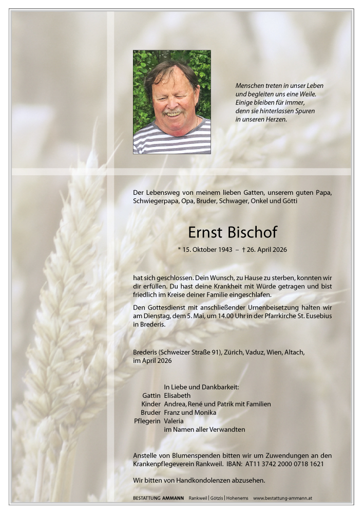 Bestattung wurde durchgeführt von: Bestattung Ammann Rankweil Ammann Bestattung GmbH Rankweil Splügenweg 1 6830 - Rankweil Tel.: 05522 42104 zum Bestatter