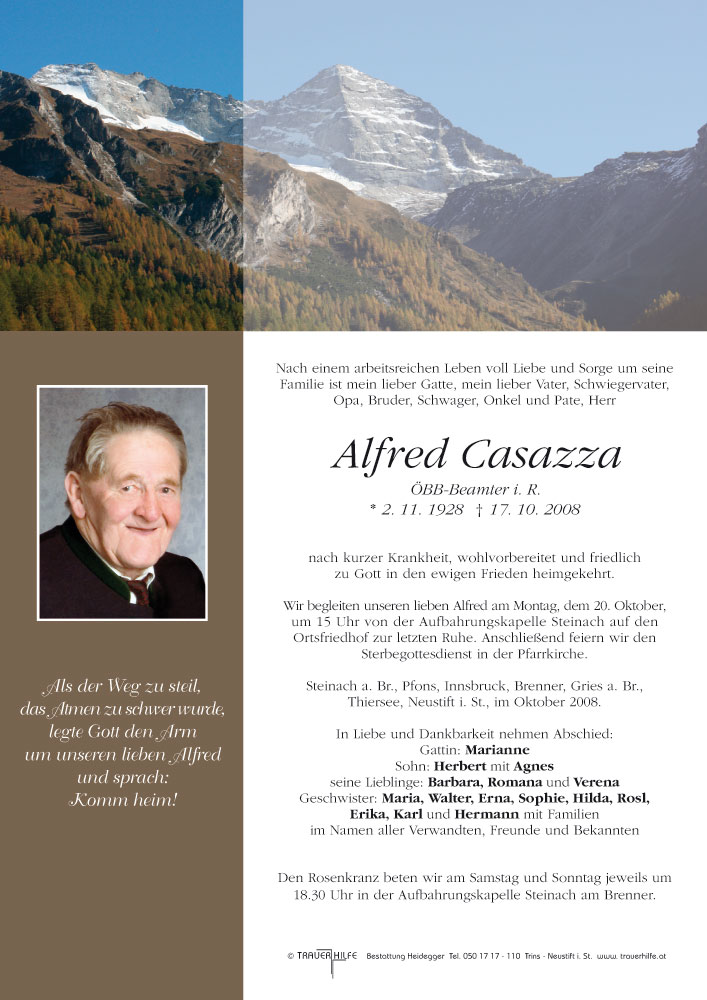 Bestattung wurde durchgeführt von: Karl Neurauter Karl Neurauter Bestattung Heidegger Brennerstraße 69 6150 - Steinach am Brenner Tel.: 05275 5211 zum Bestatter