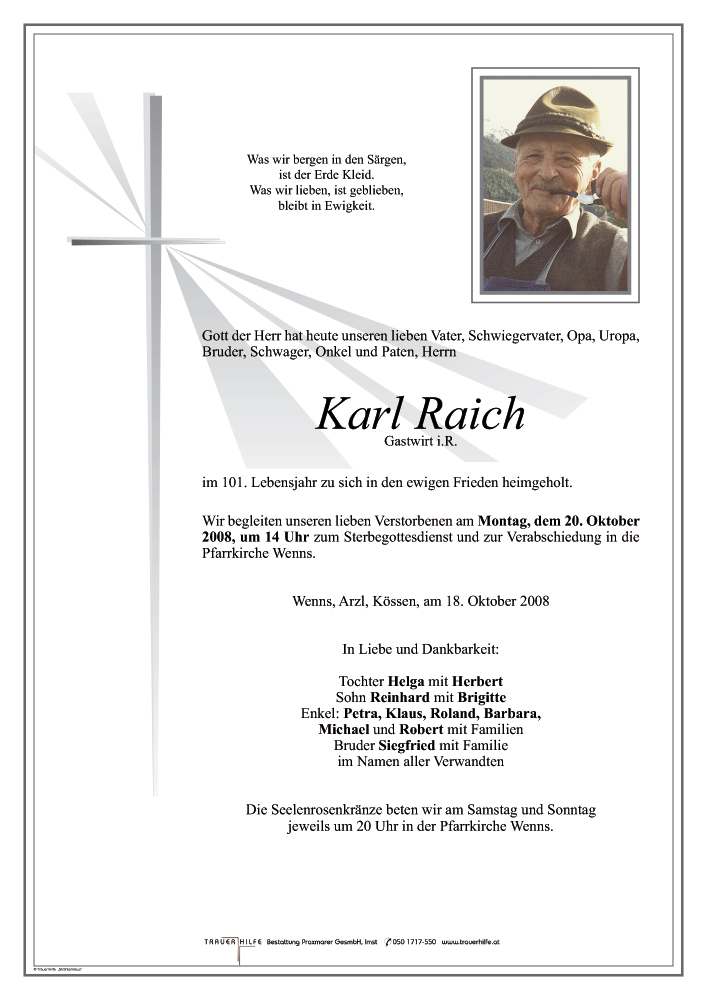 In meiner Zeit bei der Bezirkslandwirtschaftskammer Imst haben wir oft Veranstaltungen in Eurem Gasthaus abgehalten. Es war gemütlich und ich sehe Karl vor mir sitzen bei einem gemütlichen Hoangart mit seiner Pfeife. Er hat auch vor meiner Zeit bei der LWK als Raupenfahrer gearbeitet. Seine Frau hat uns immer sehr fleißig aufgekocht. Herr gib ihnen beiden die ewige Ruhe. Andreas