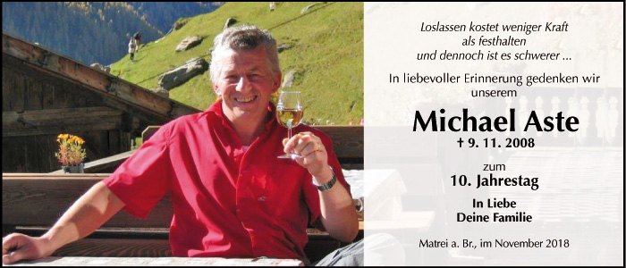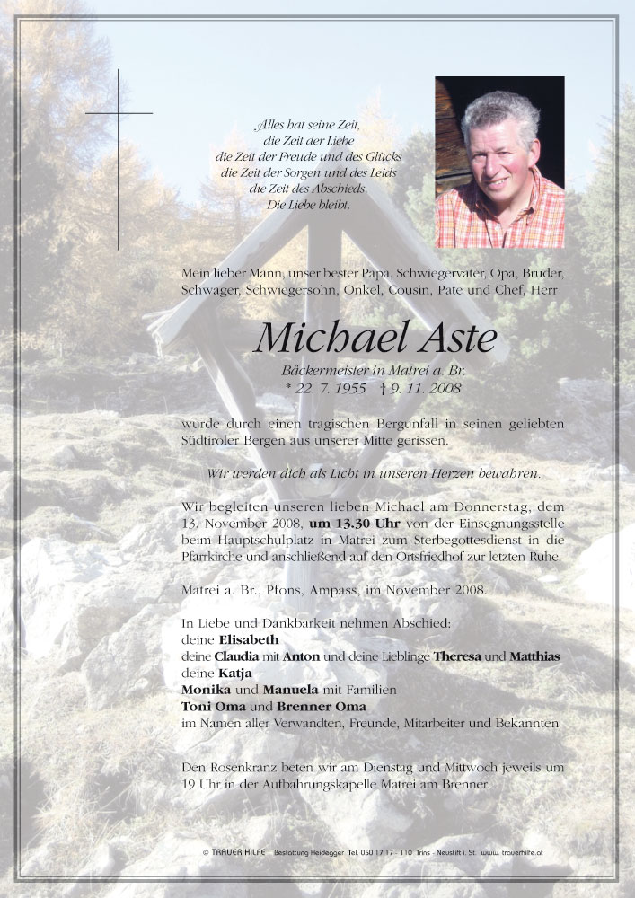 Bestattung wurde durchgeführt von: Karl Neurauter Karl Neurauter Bestattung Heidegger Brennerstraße 69 6150 - Steinach am Brenner Tel.: 05275 5211 zum Bestatter