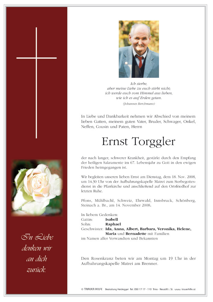 Bestattung wurde durchgeführt von: Karl Neurauter Karl Neurauter Bestattung Heidegger Brennerstraße 69 6150 - Steinach am Brenner Tel.: 05275 5211 zum Bestatter