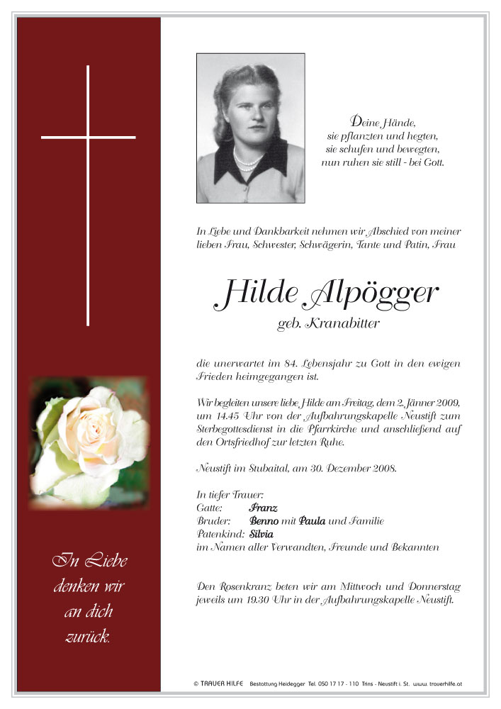 Bestattung wurde durchgeführt von: Karl Neurauter Karl Neurauter Bestattung Heidegger Brennerstraße 69 6150 - Steinach am Brenner Tel.: 05275 5211 zum Bestatter