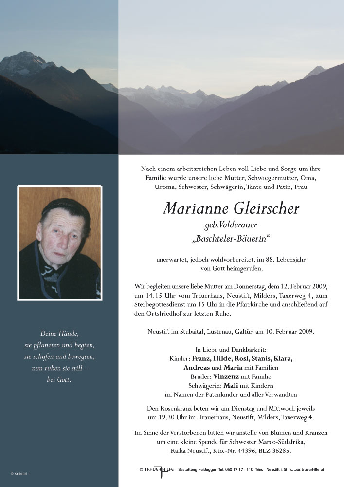 Neue Kerze für Marianne Gleirscher entzünden.