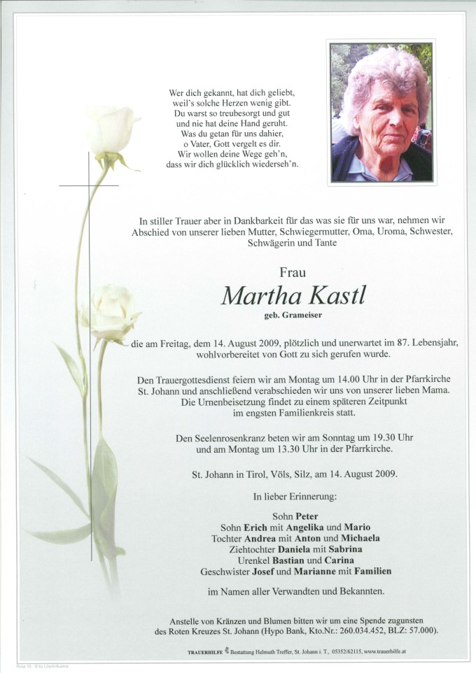 Bestattung wurde durchgeführt von: Bestattung St. Johann Huber-Sturm Bestattung St. Johann Huber-Sturm Bestattung St. Johann Huber-Sturm GmbH Salzburgerstraße 27 6380 - St. Johann in Tirol Tel.: 050 1717 190 zum Bestatter