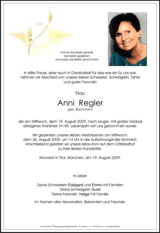 Bestattung wurde durchgeführt von: Bestattung St. Johann Huber-Sturm Bestattung St. Johann Huber-Sturm Bestattung St. Johann Huber-Sturm GmbH Salzburgerstraße 27 6380 - St. Johann in Tirol Tel.: 050 1717 190 zum Bestatter