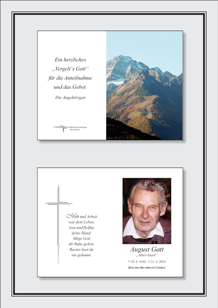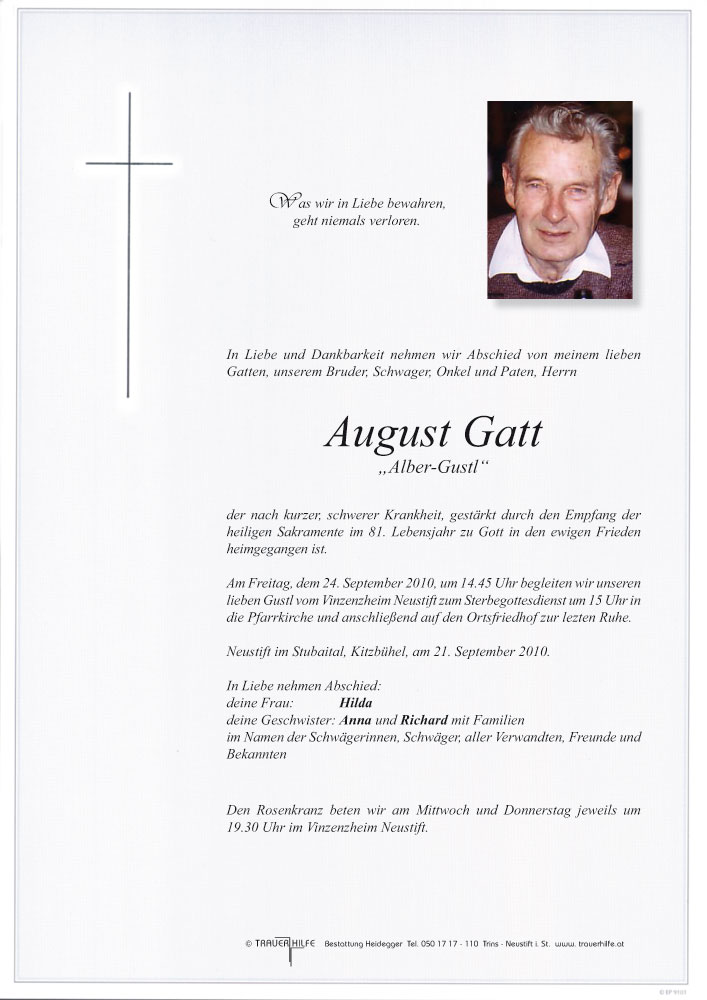 Bestattung wurde durchgeführt von: Karl Neurauter Karl Neurauter Bestattung Heidegger Brennerstraße 69 6150 - Steinach am Brenner Tel.: 05275 5211 zum Bestatter