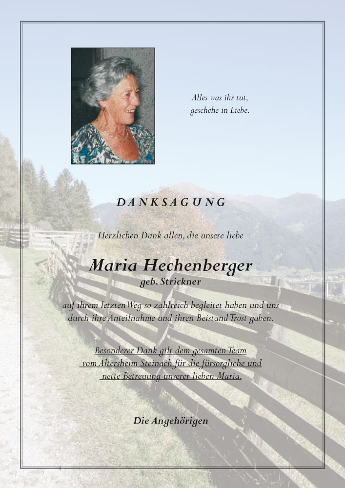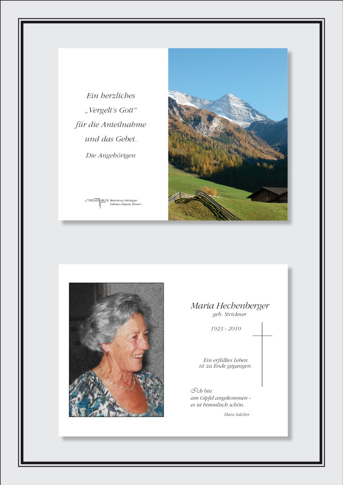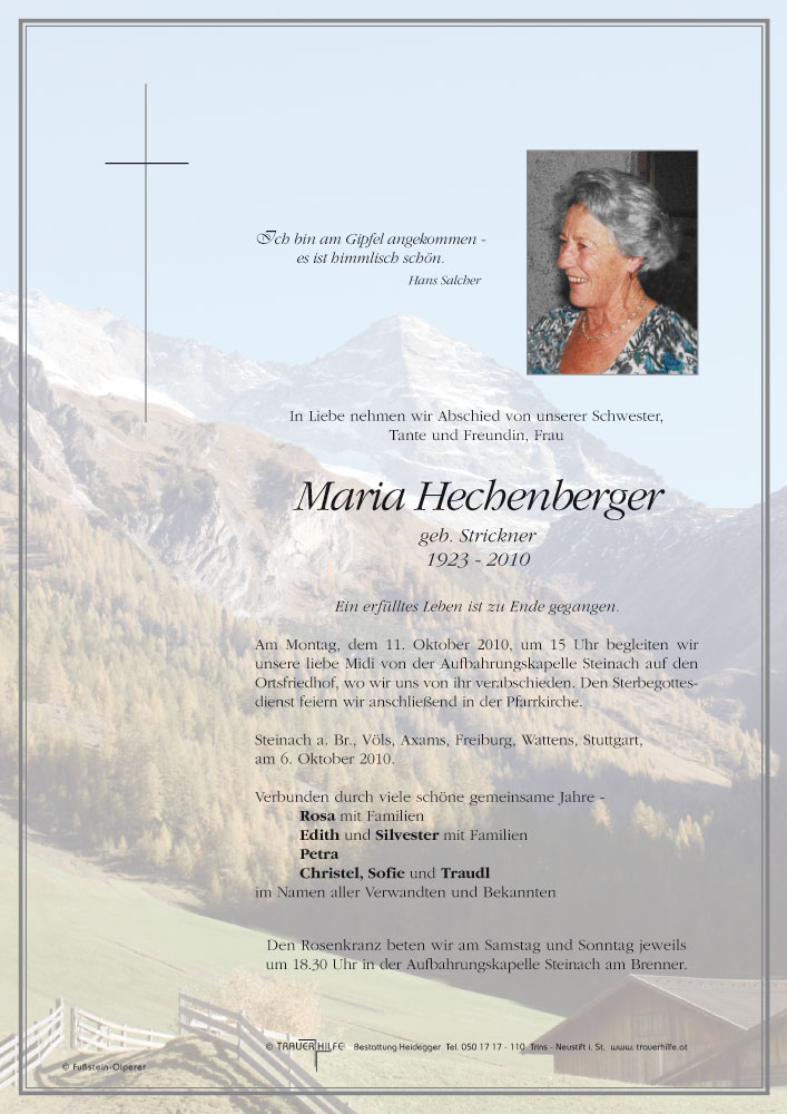 Bestattung wurde durchgeführt von: Karl Neurauter Karl Neurauter Bestattung Heidegger Brennerstraße 69 6150 - Steinach am Brenner Tel.: 05275 5211 zum Bestatter