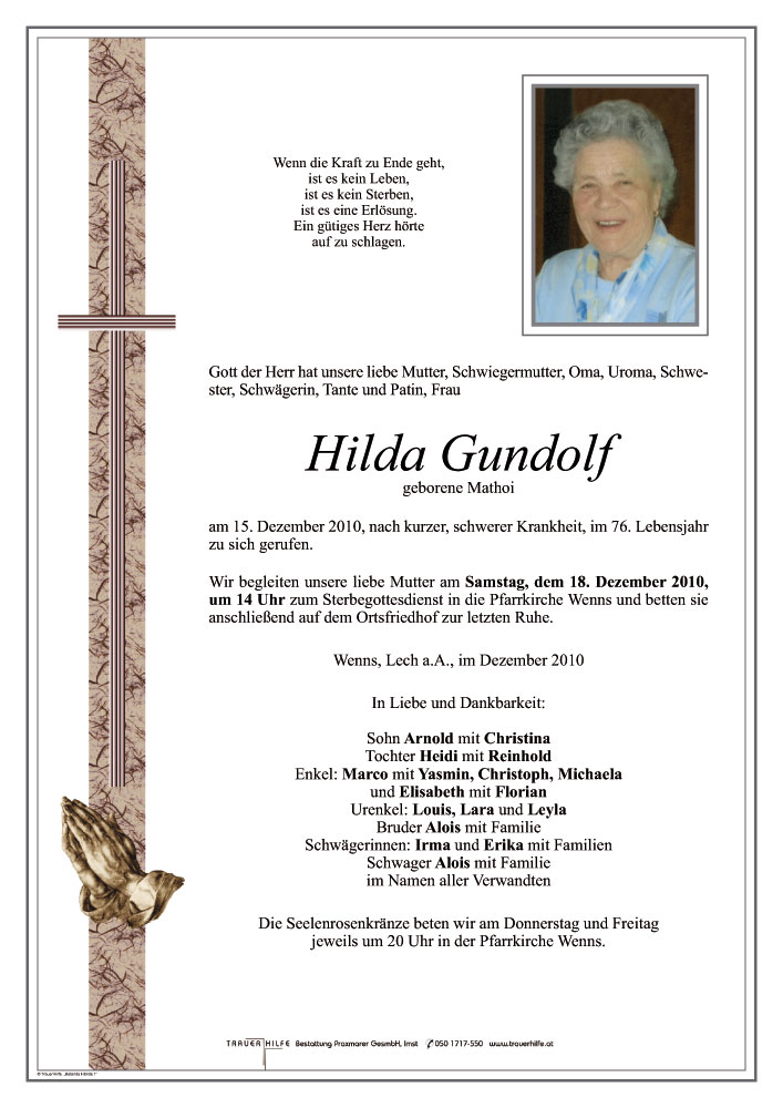 Gretl betet für eure Mutter zu Hause in jeder freien Minute. Leider ist es Gretl nicht möglich, an der Beisetzung eurer lieben Mutter teilzunehmen.26.10.2010 18:52 - Streng Gretl mit Fam. Piller