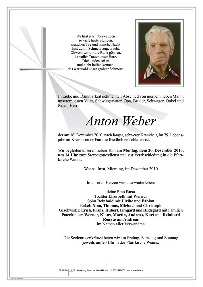 Liebe Rosa möge Dir der liebe Gott die Kraft geben, um die Lücke zu schließen, die Dein Anton hinterläßt.