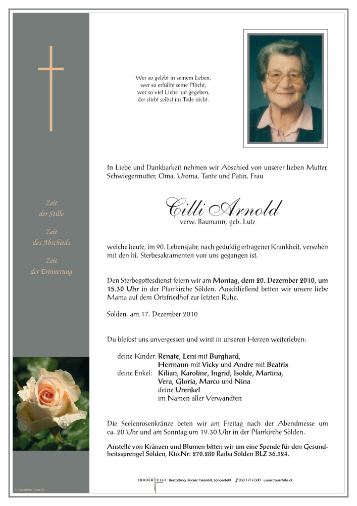 So wünschen wir dir, liebe Leni und auch meinem Tete Burghard, viele schöne und wertvolle Erinnerungen an eure liebe Verstorbene, die ihr zeitlebens in euren Gedanken, vorallem aber in euren Herzen tragen werdet.