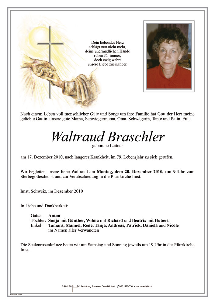 ... immer wenn ich an deinem Elternhaus vorbeifahre, kommen mir Kindheitserinnerungen an deine Mama in den Sinn, sie war immer auf den Sprung, immer fleißig und um ihre Familie bemüht, ich werde sie immer in sehr guten Erinnerungen behalten und glaub mir liebe Beatrix, deine Mama ist immer bei dir, du wirst es spüren!
